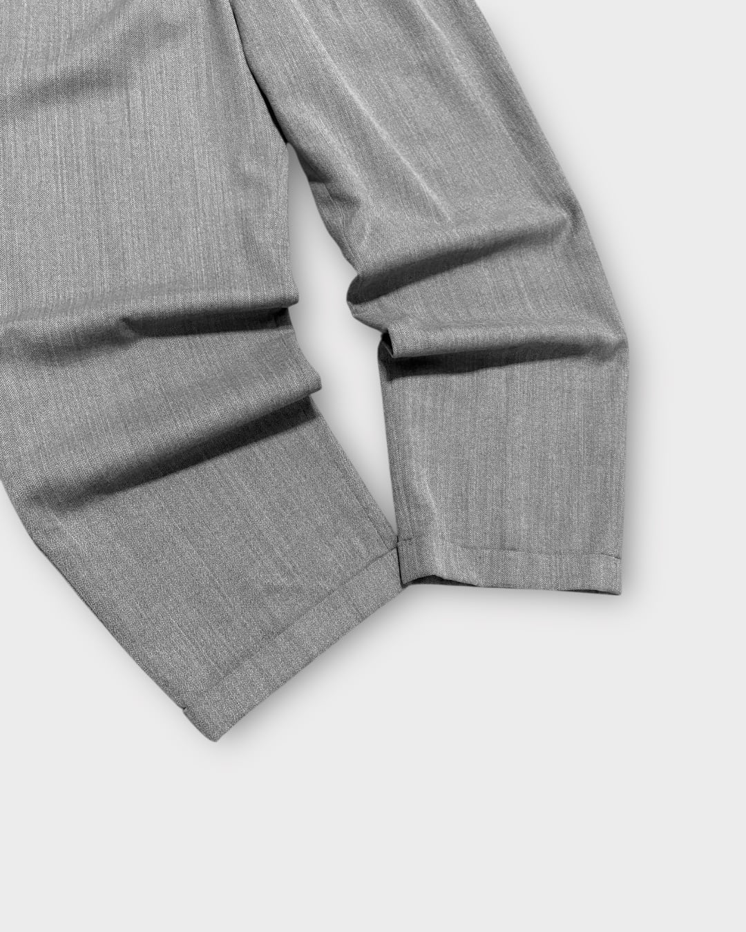 グレーのヘリンボーン生地で、無地より表情がありつつも落ち着いた印象にまとまる一本です。