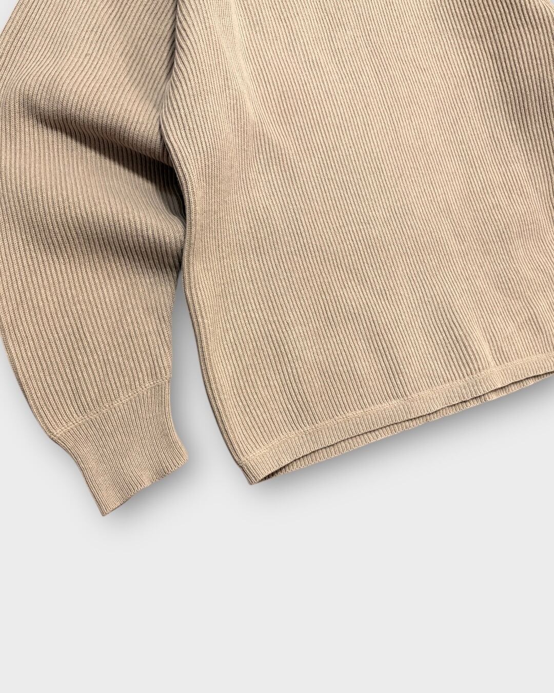 ベージュ系の柔らかな色味に、表情のあるリブ編みが自然な奥行きがあります。