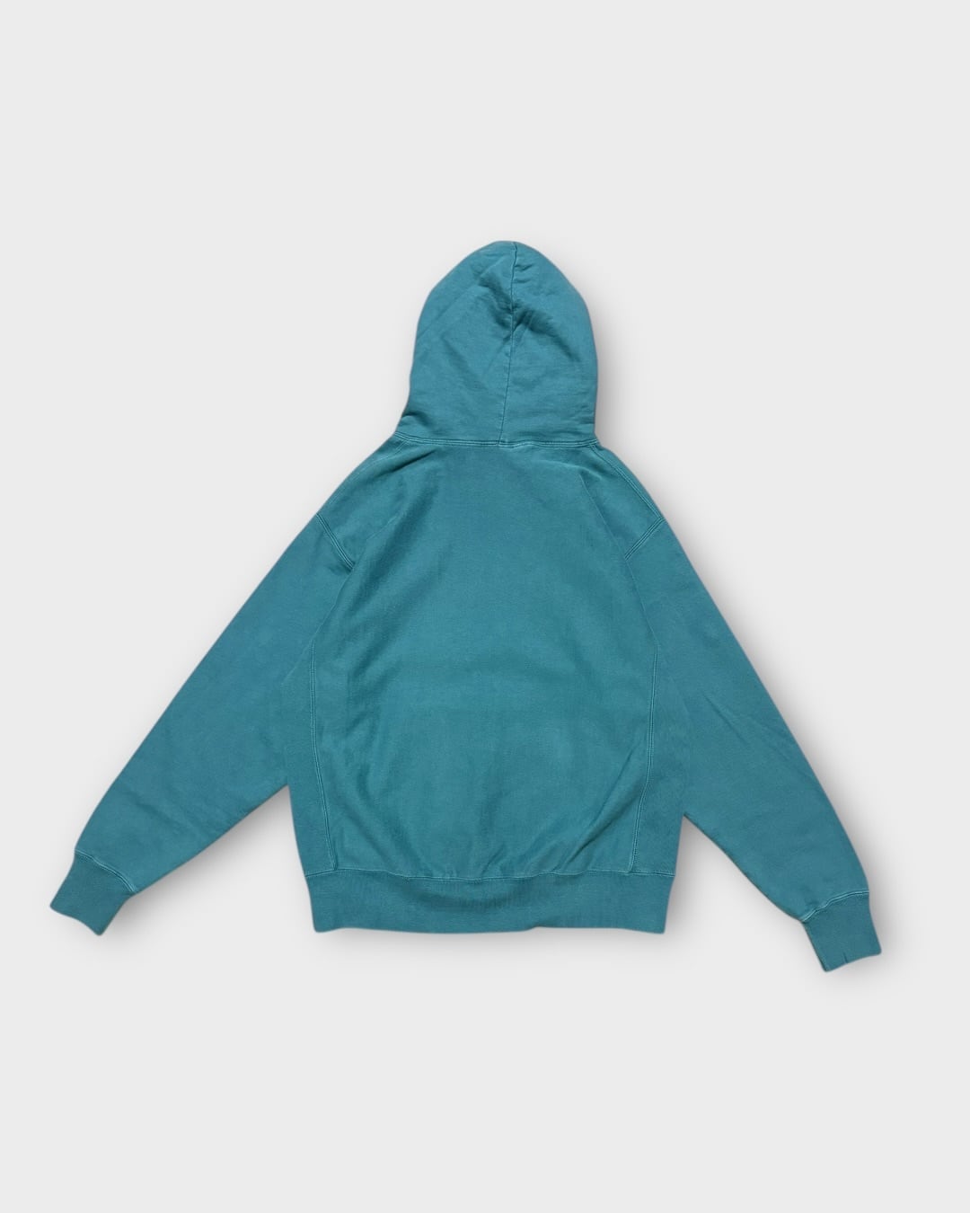 オーバーダイ加工による、ブルーとグリーンが混ざり合ったような、くすみのある独特なカラーが印象的な一着です。