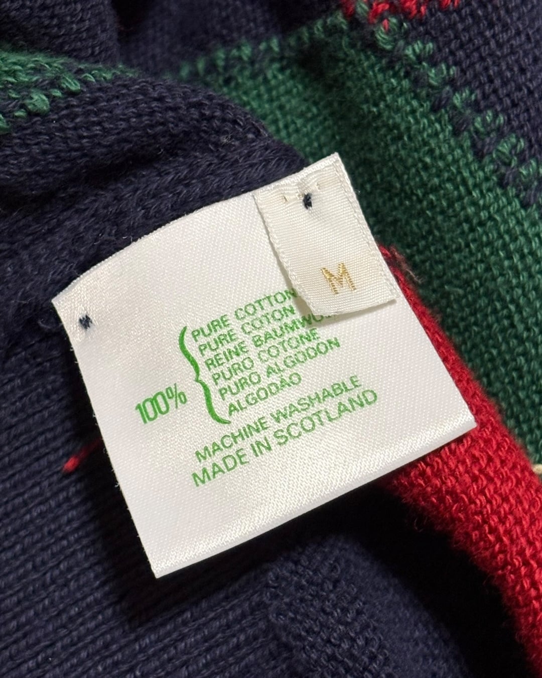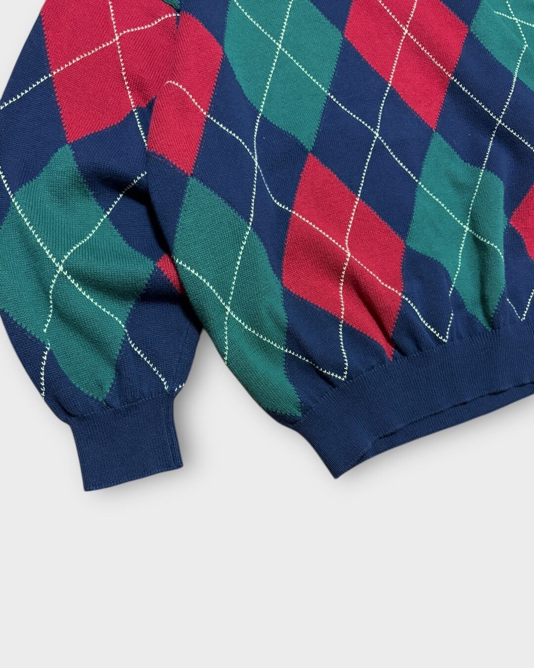 スコットランド製らしい発色の良い配色と、クラシックなアーガイルパターンが印象的な一枚です。