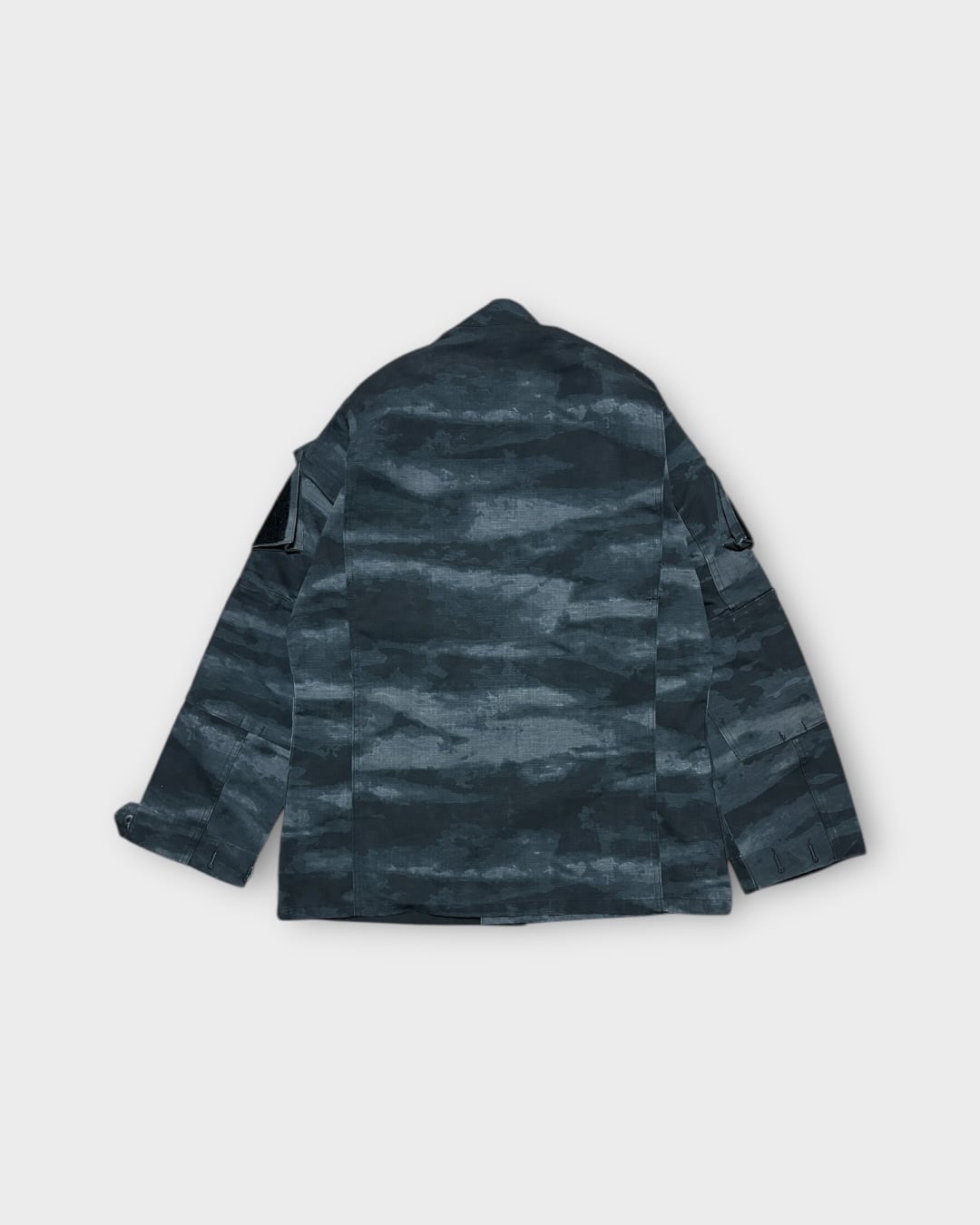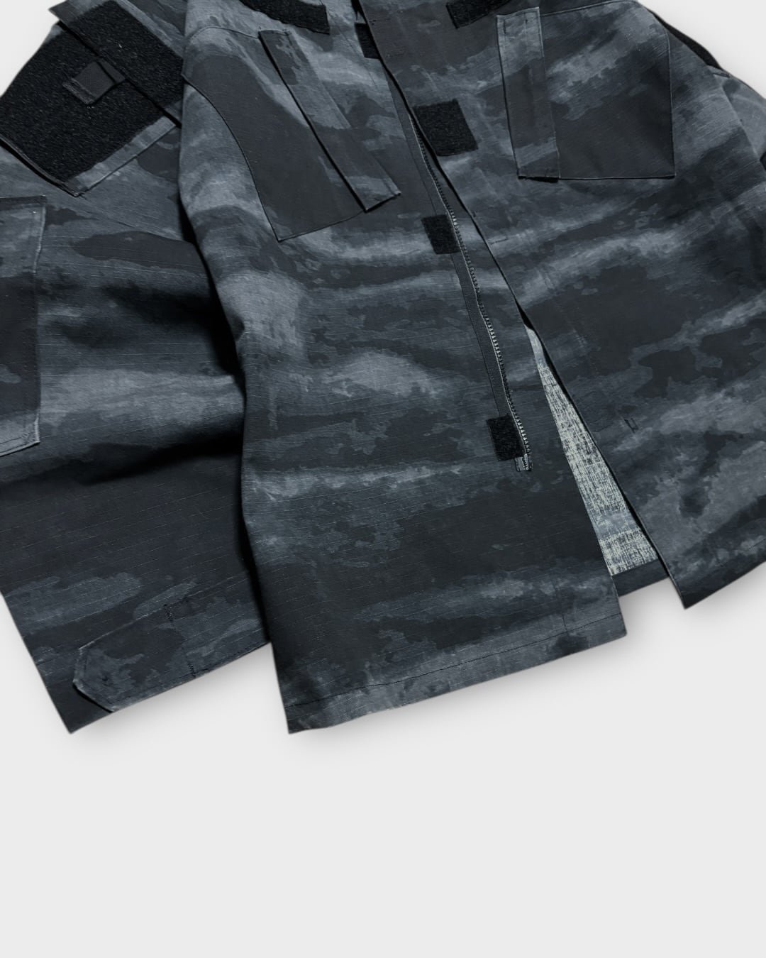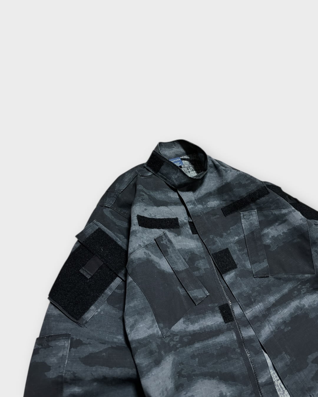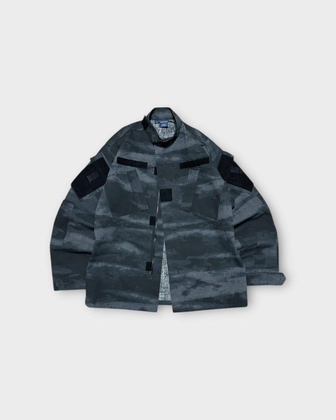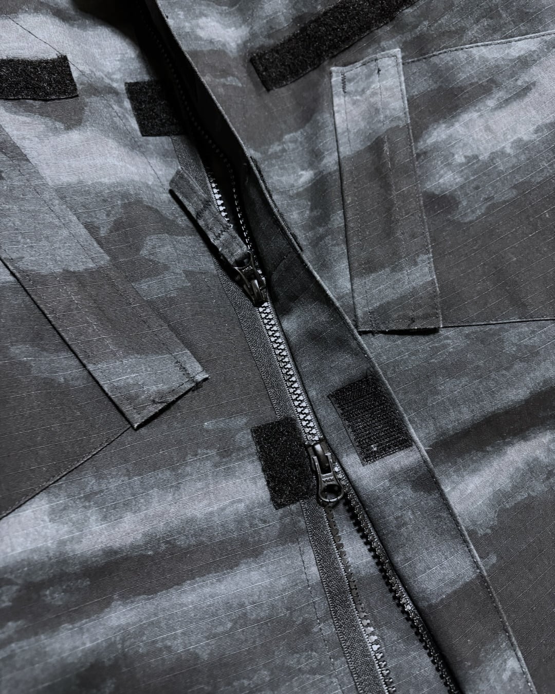 ブラックベースのカモフラージュ柄が印象的で、ミリタリー由来の機能性と落ち着いた色味がバランス良くまとまった一着です。