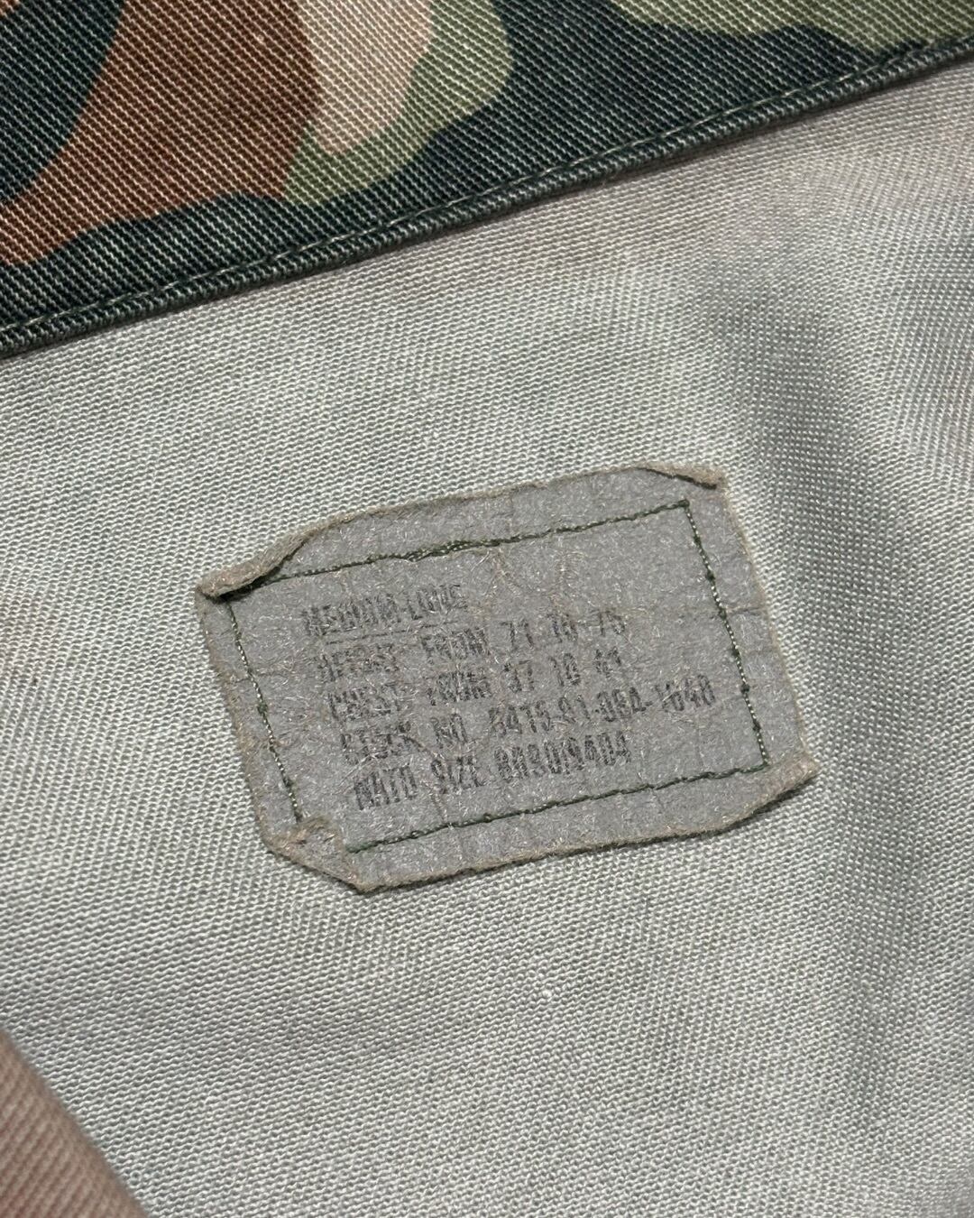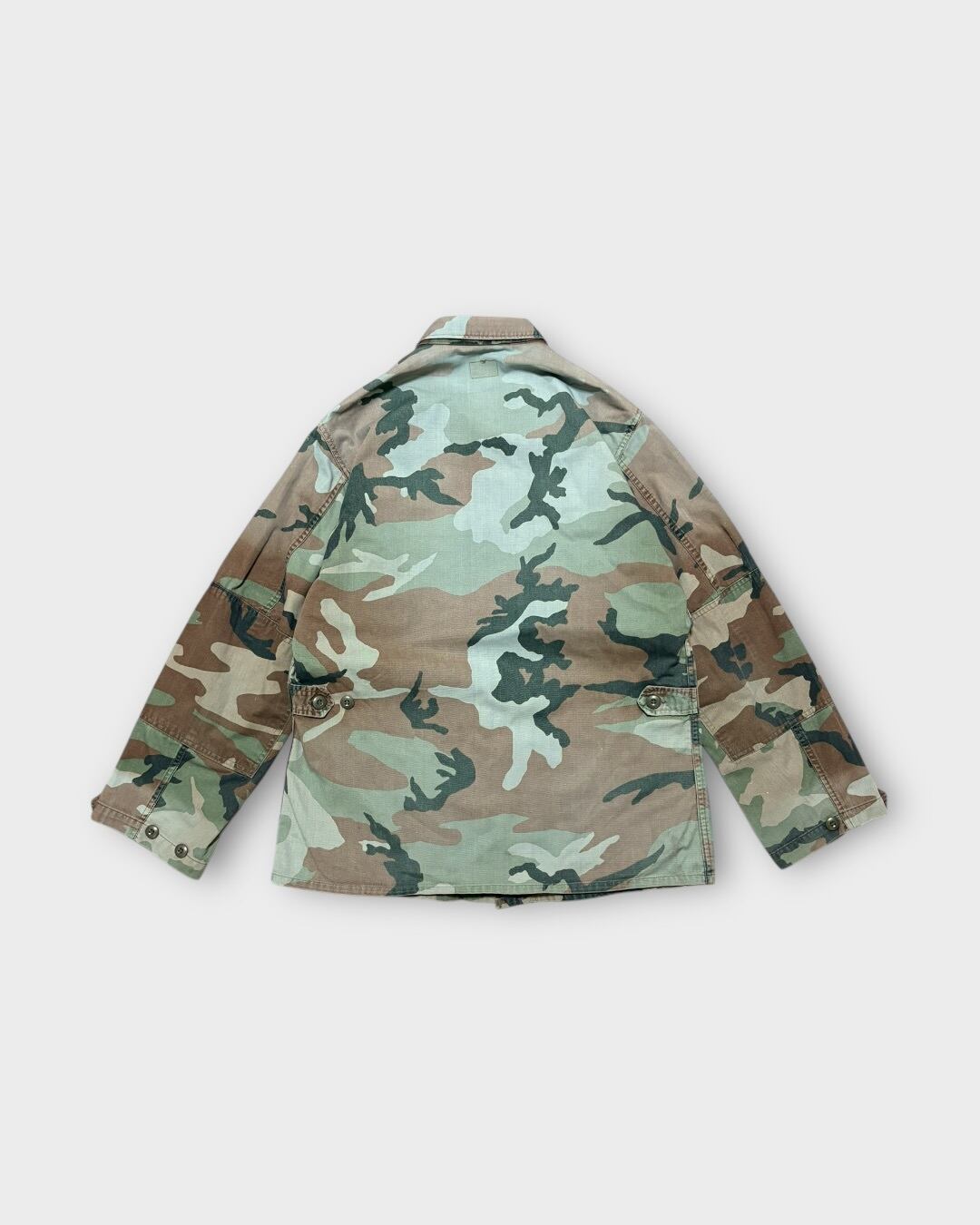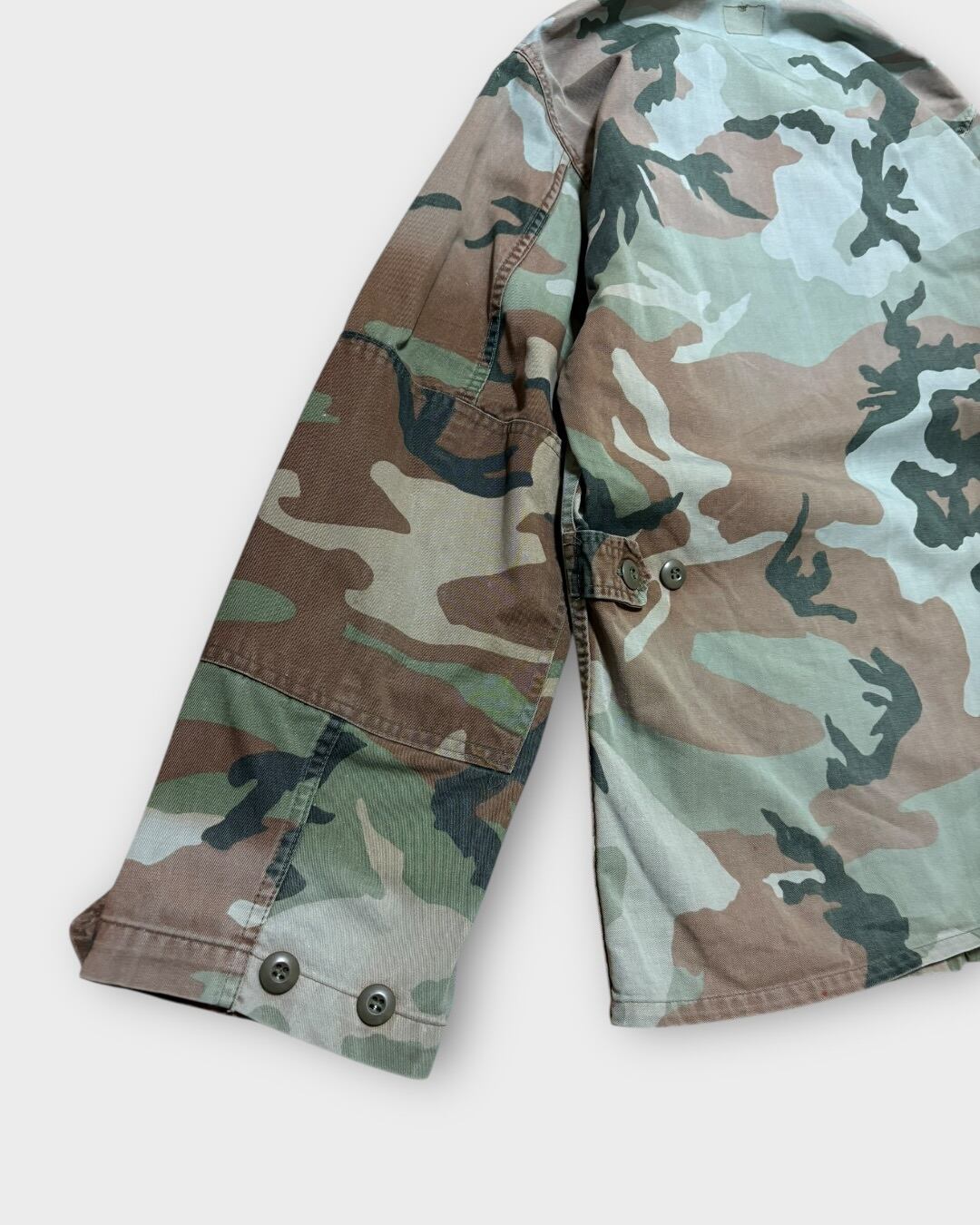 ウッドランドカモながら、長年の着用と経年により強くフェードし、もはや別の柄のようにも見える独特の表情が魅力の一着です。
