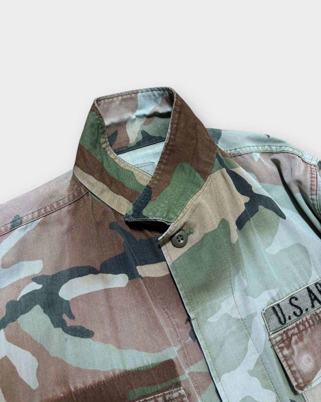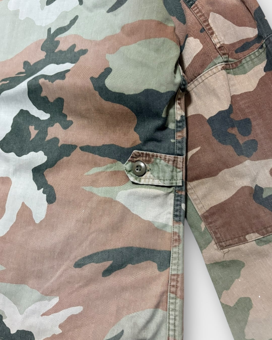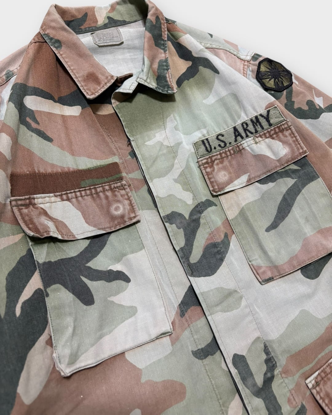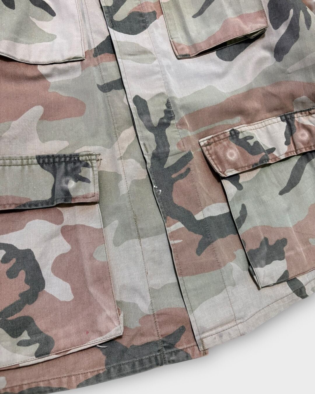 ウッドランドカモながら、長年の着用と経年により強くフェードし、もはや別の柄のようにも見える独特の表情が魅力の一着です。