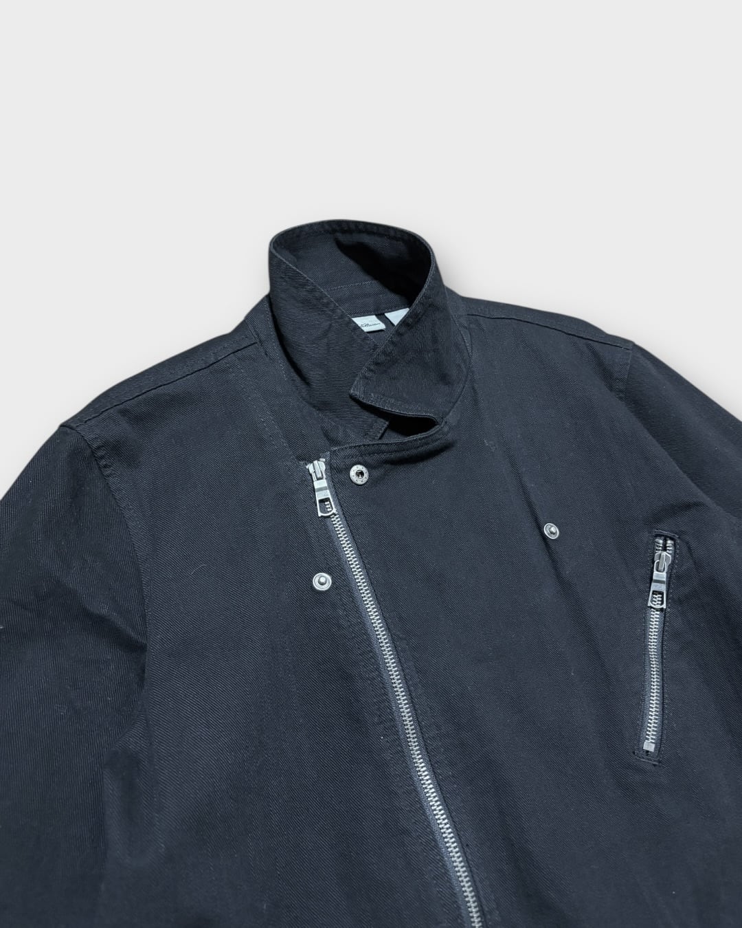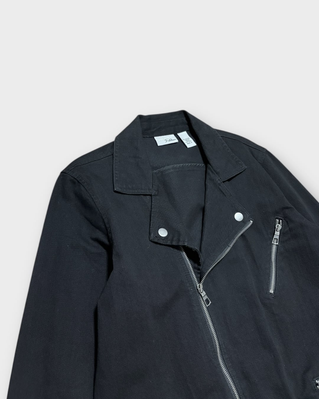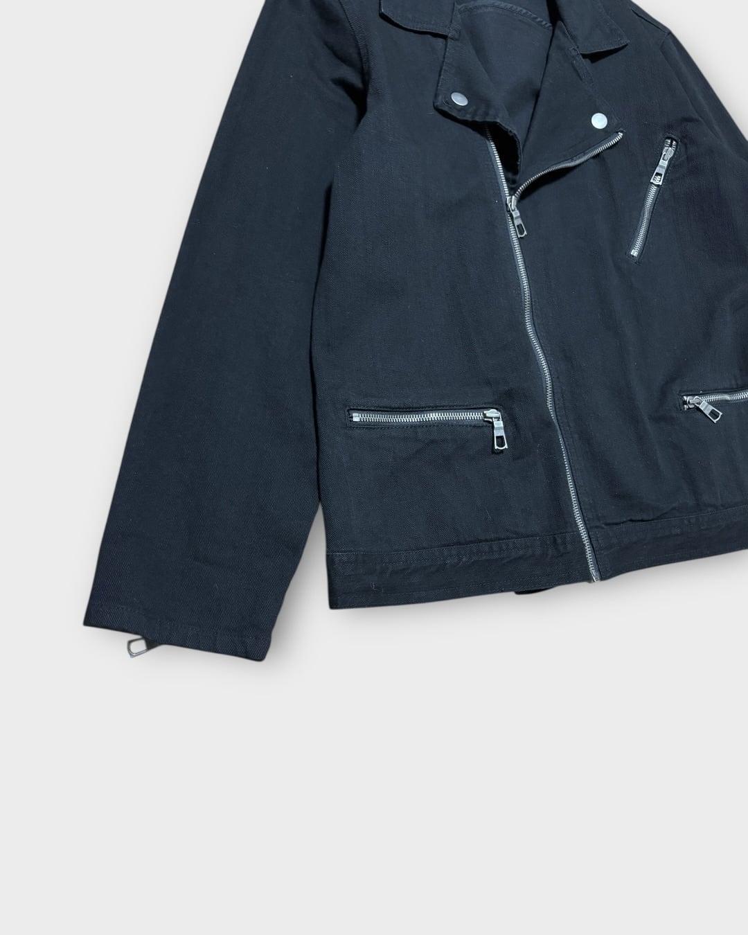 ブラックデニム特有の落ち着いた表情と、過度に主張しないライダースディテールが上品な印象。