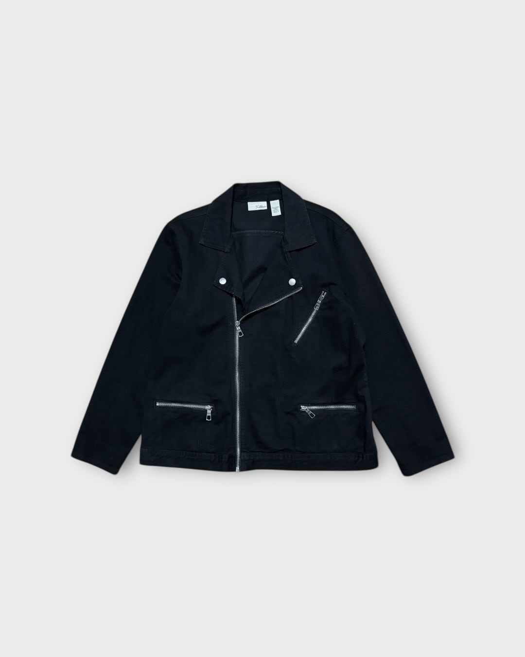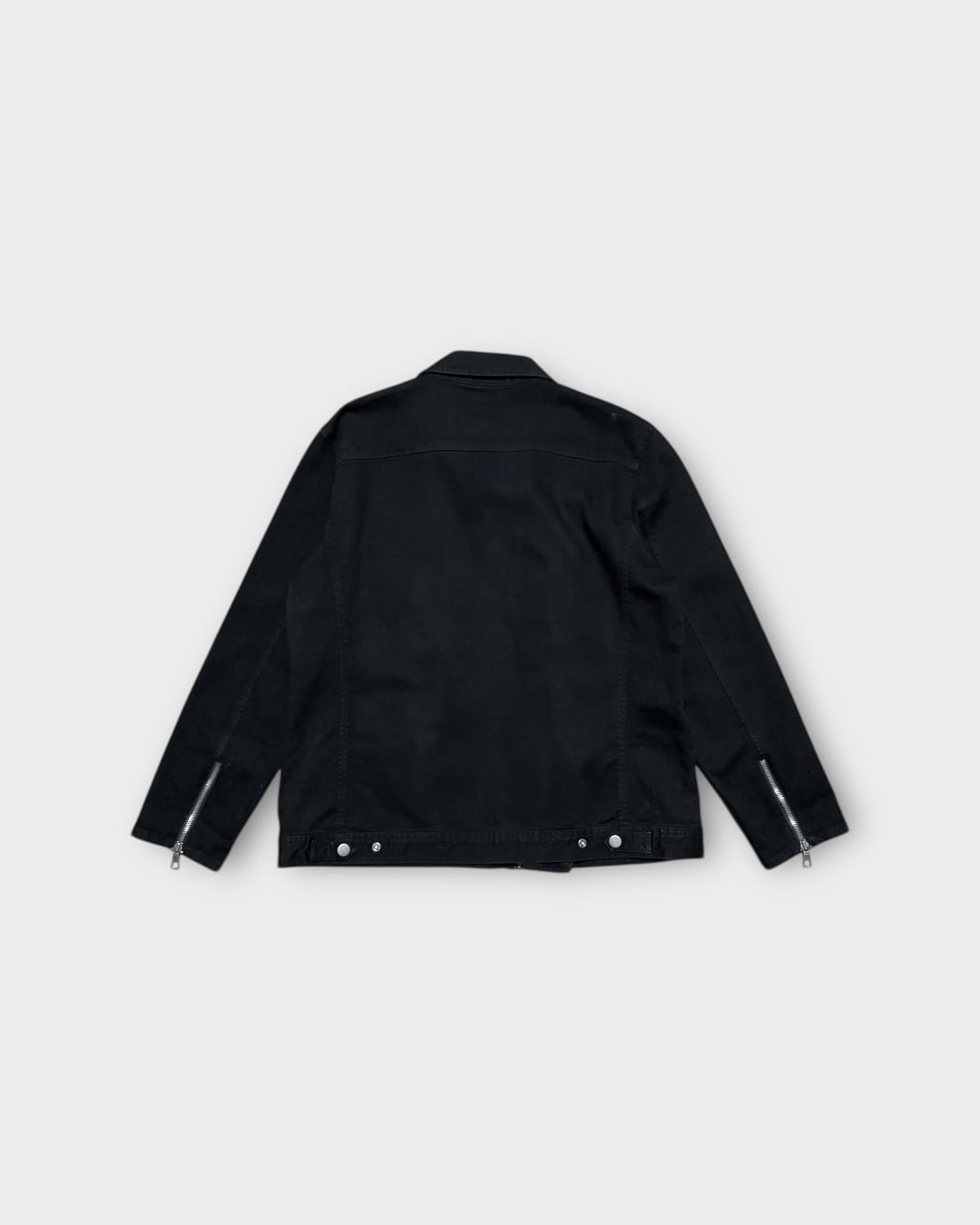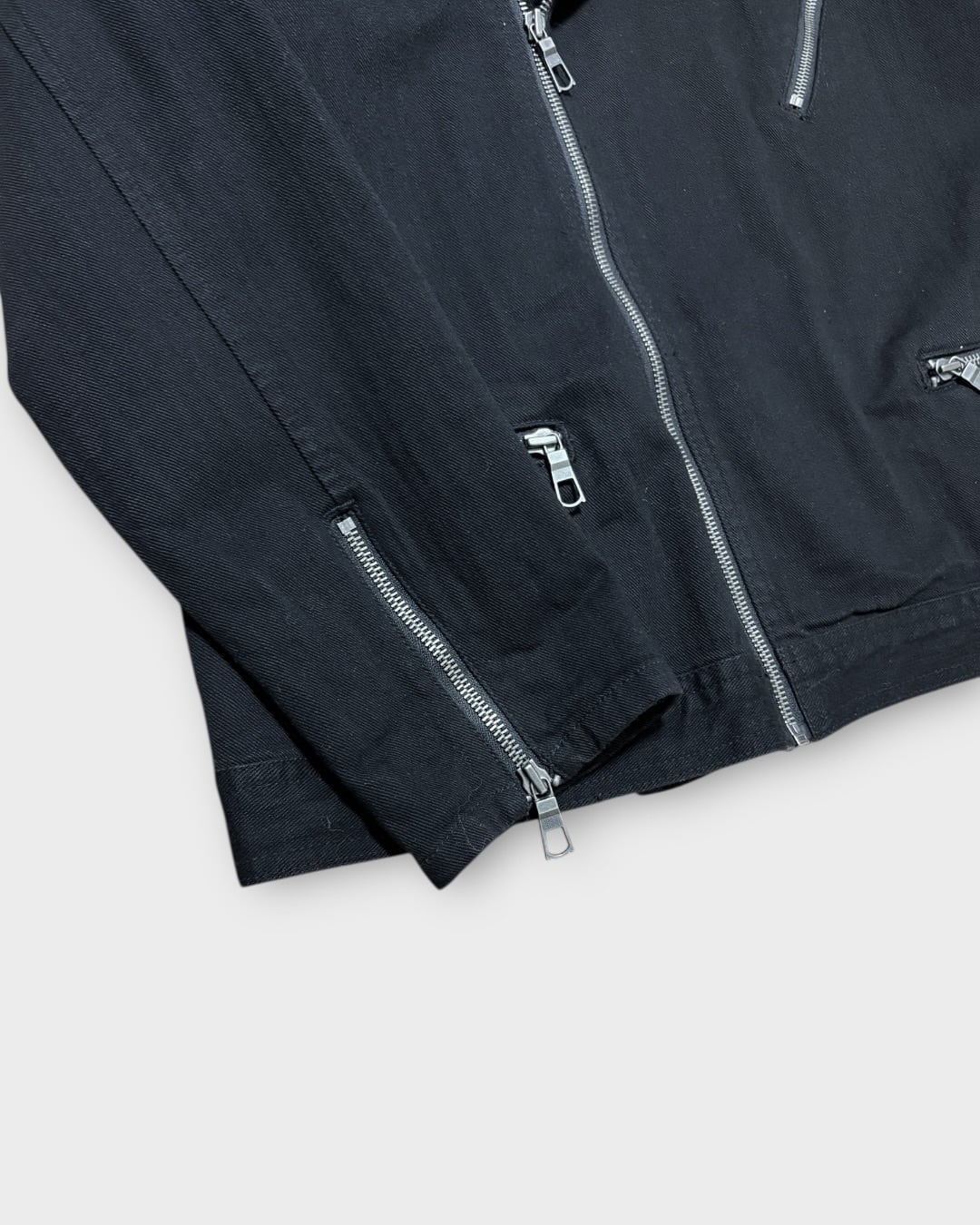 ブラックデニム特有の落ち着いた表情と、過度に主張しないライダースディテールが上品な印象。