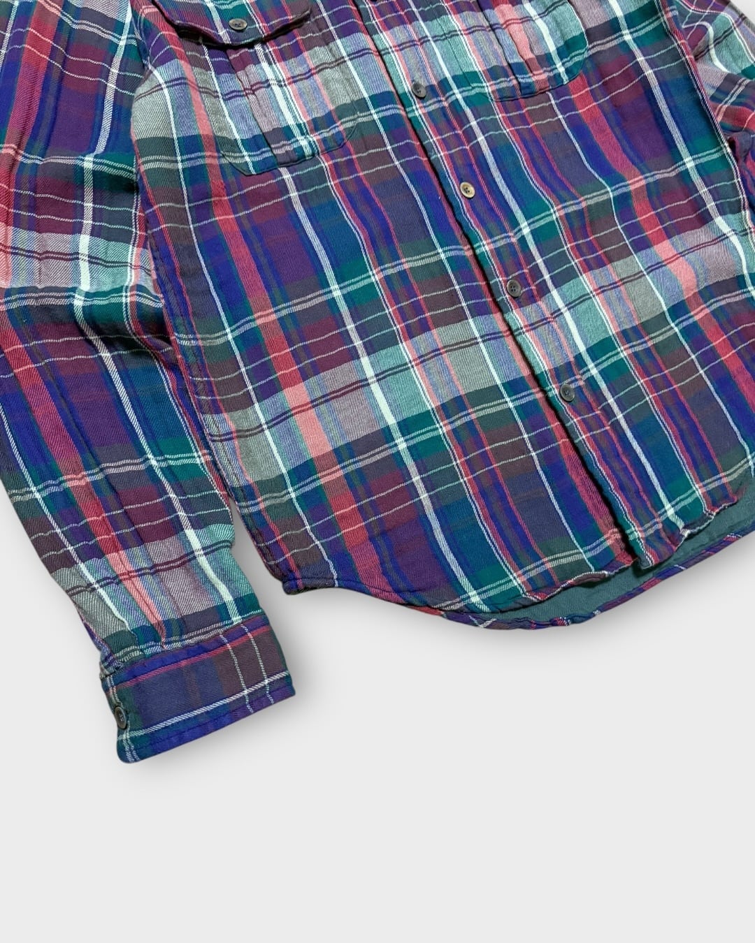 パープル、グリーン、レッドを基調とした多色使いのチェック柄が印象的な一枚です。