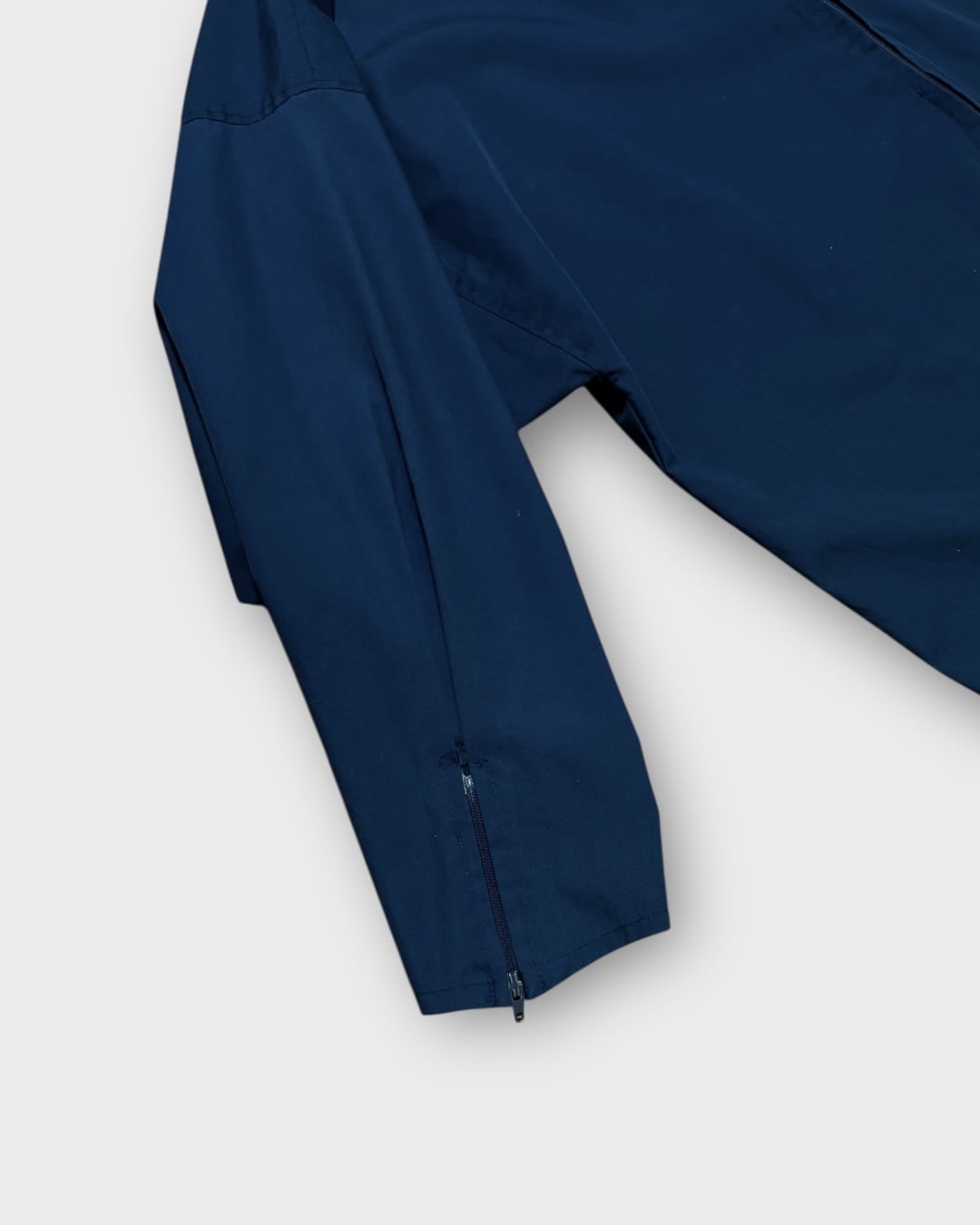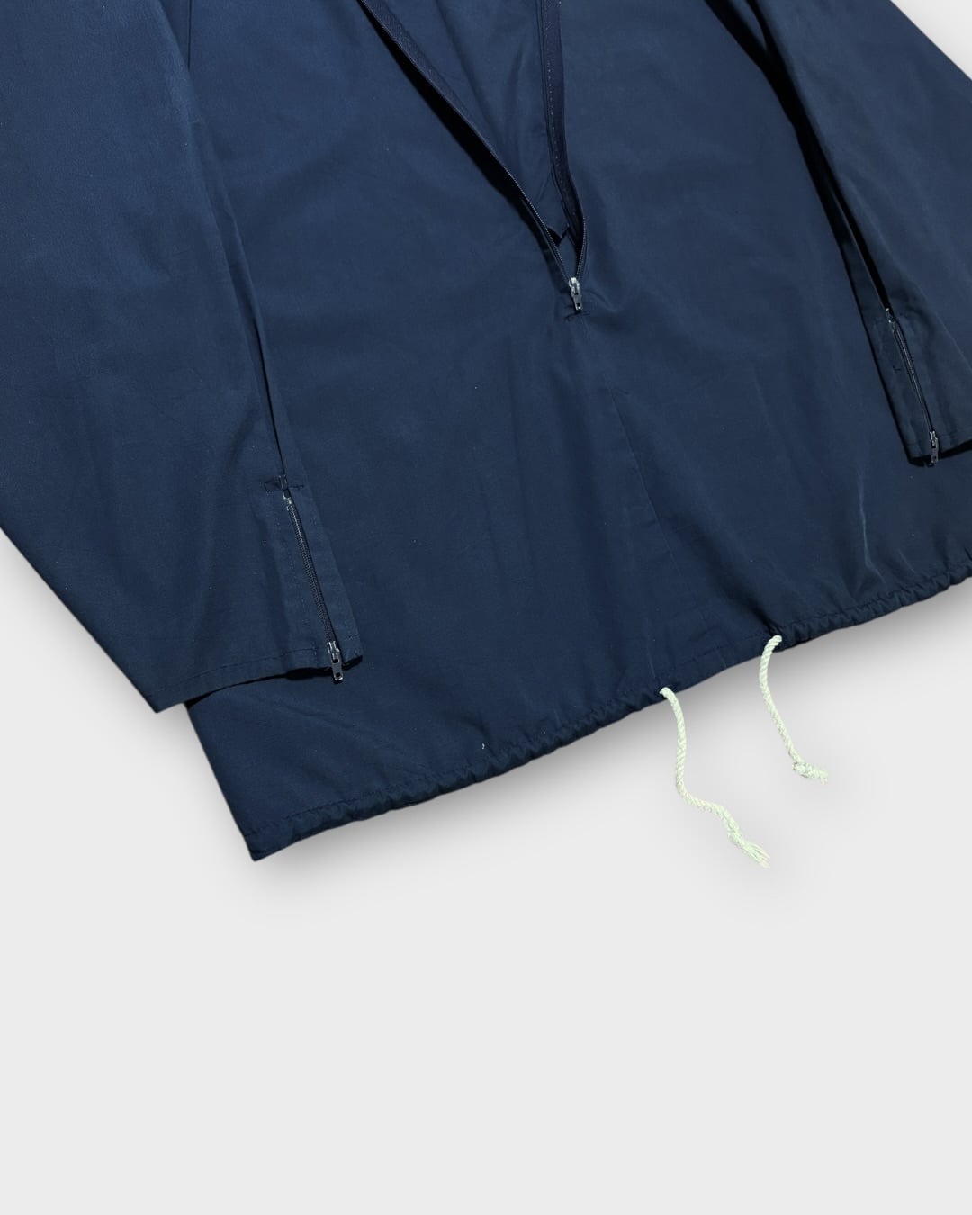 深く入ったフロントジップ、ドルマンスリーブ、裾のドローコード仕様。