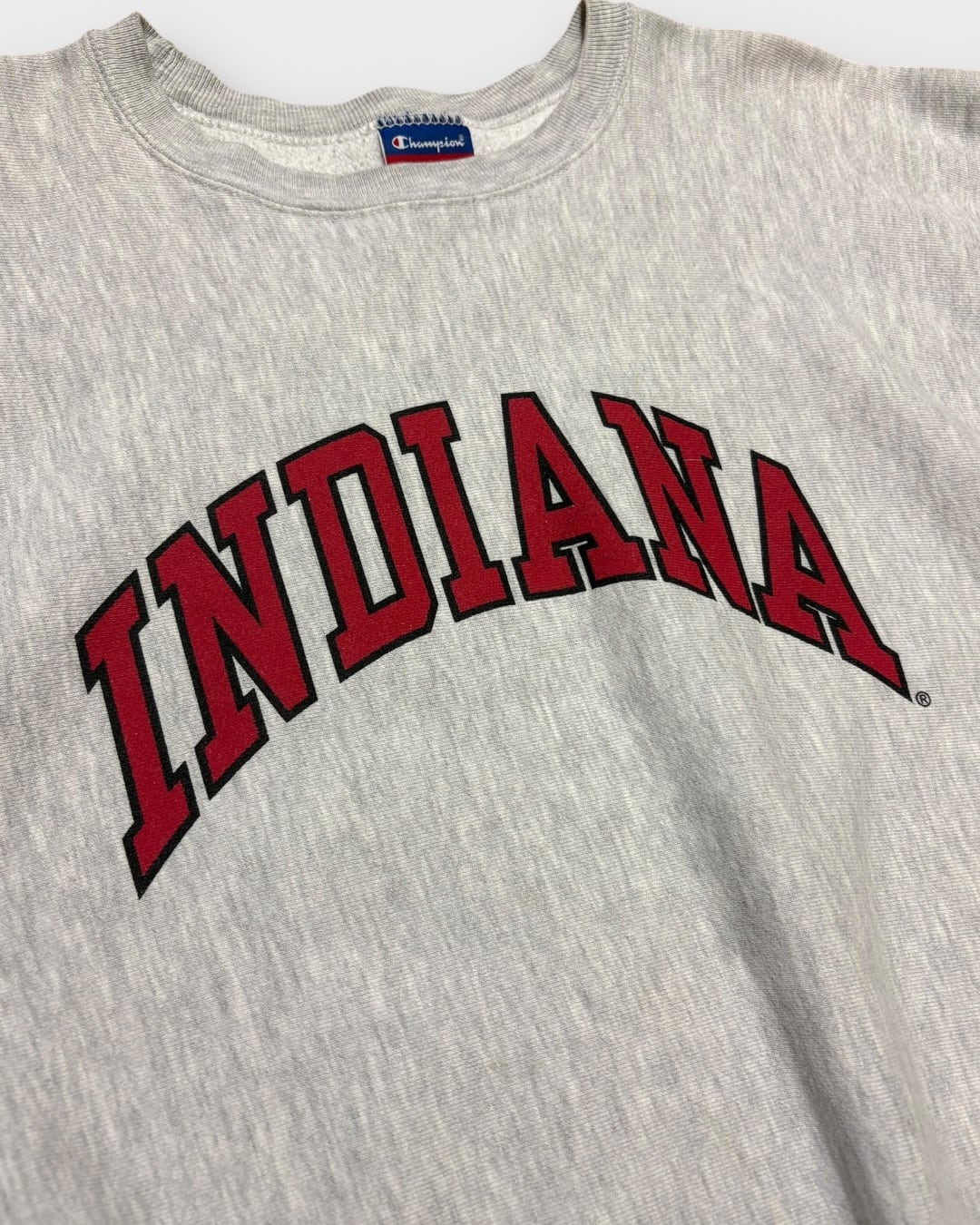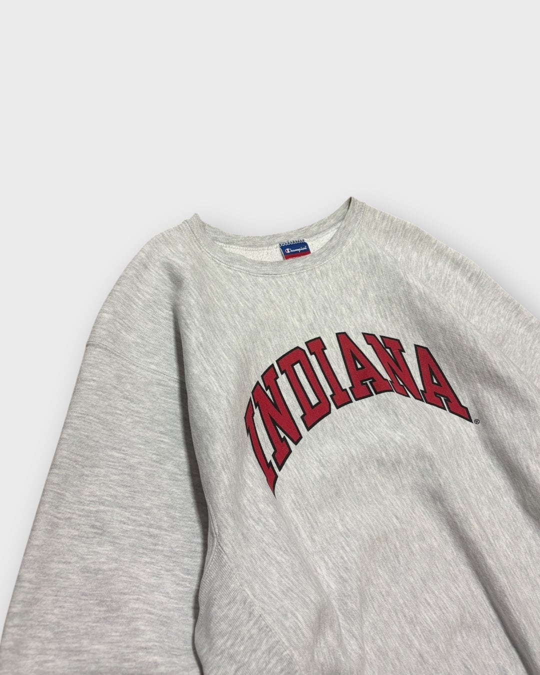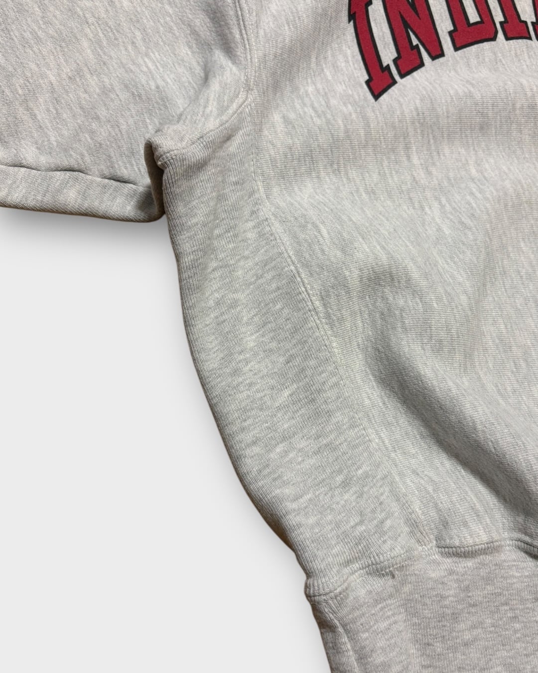 グレー無地ボディに、赤のアーチロゴ「INDIANA」が映えるカレッジスウェット。