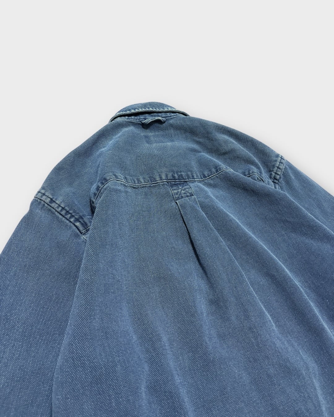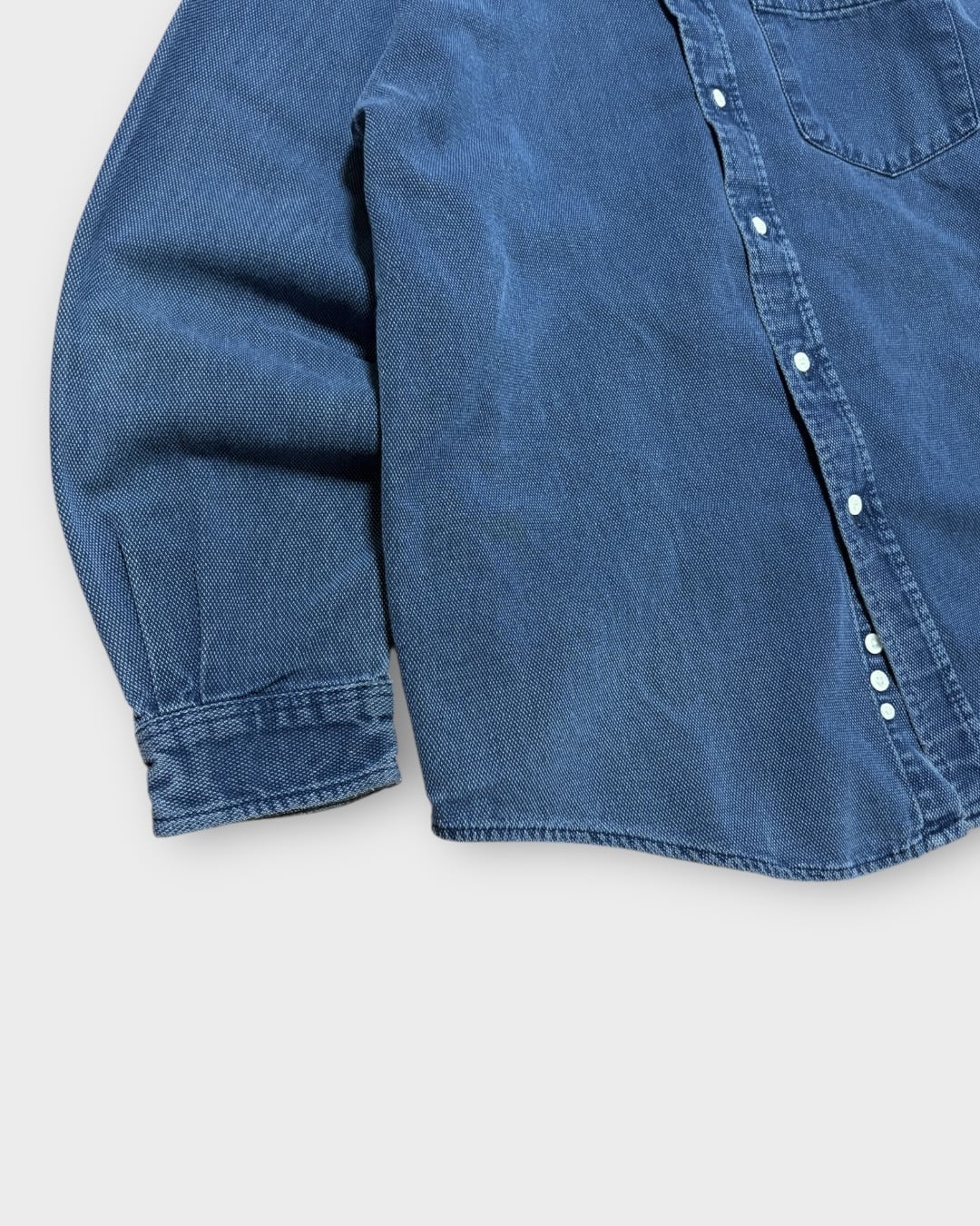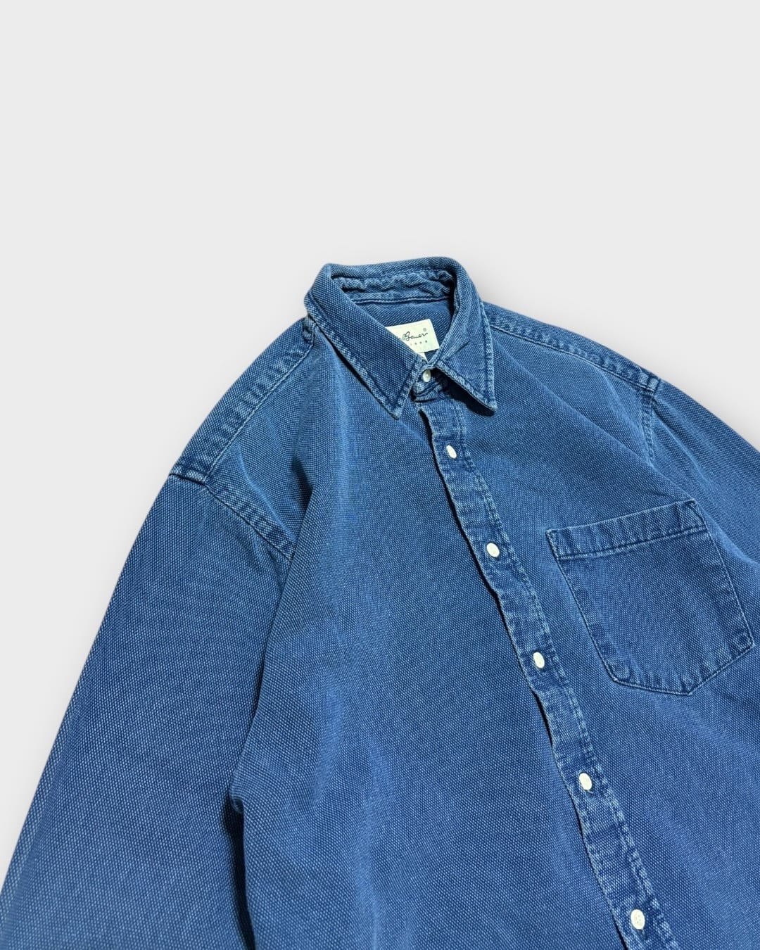 一般的なデニムシャツとは少し違う、キャンバスのような織りの生地が特徴的な一枚。
