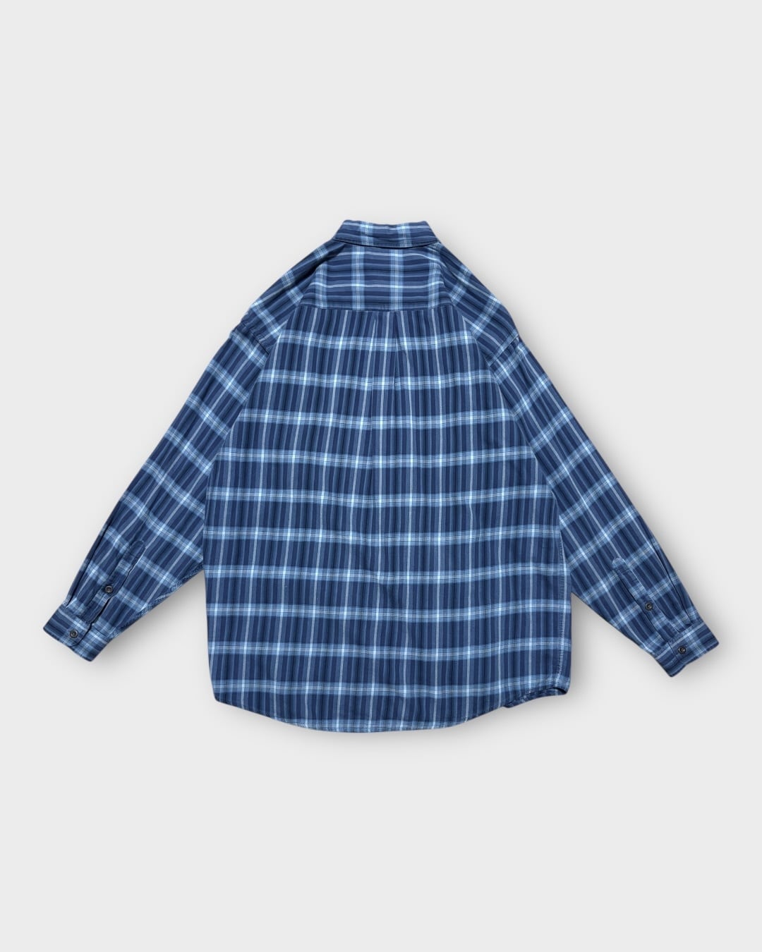 横方向の間隔が広めに取られたチェックパターンで、一般的なチェックシャツとは少し違った雰囲気があります。