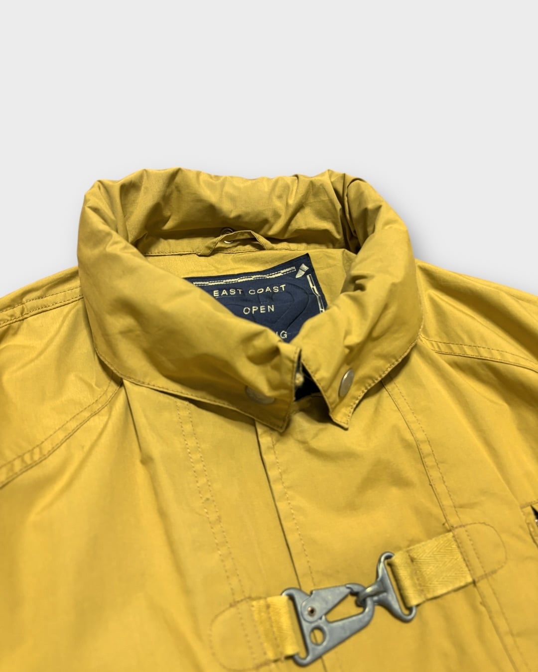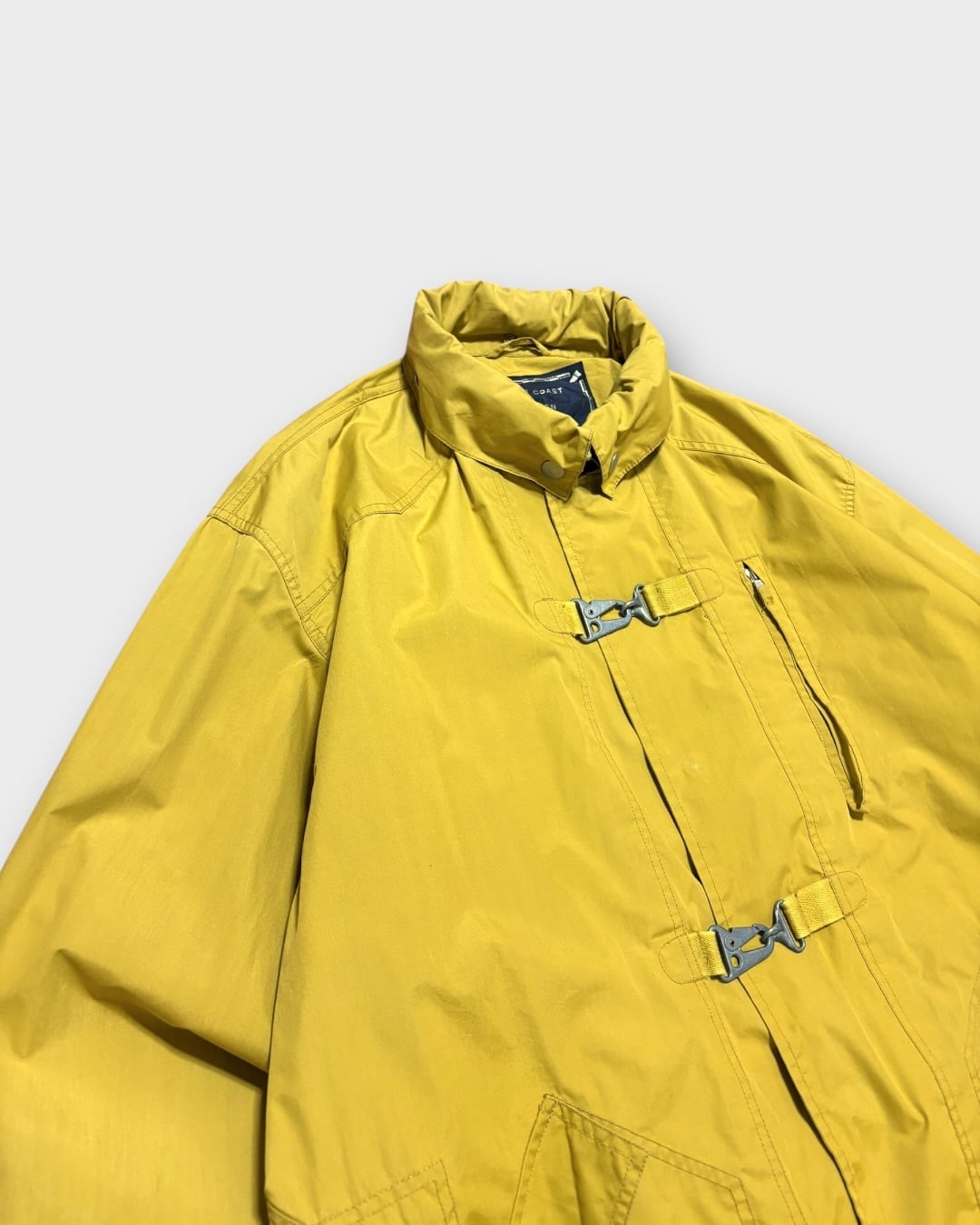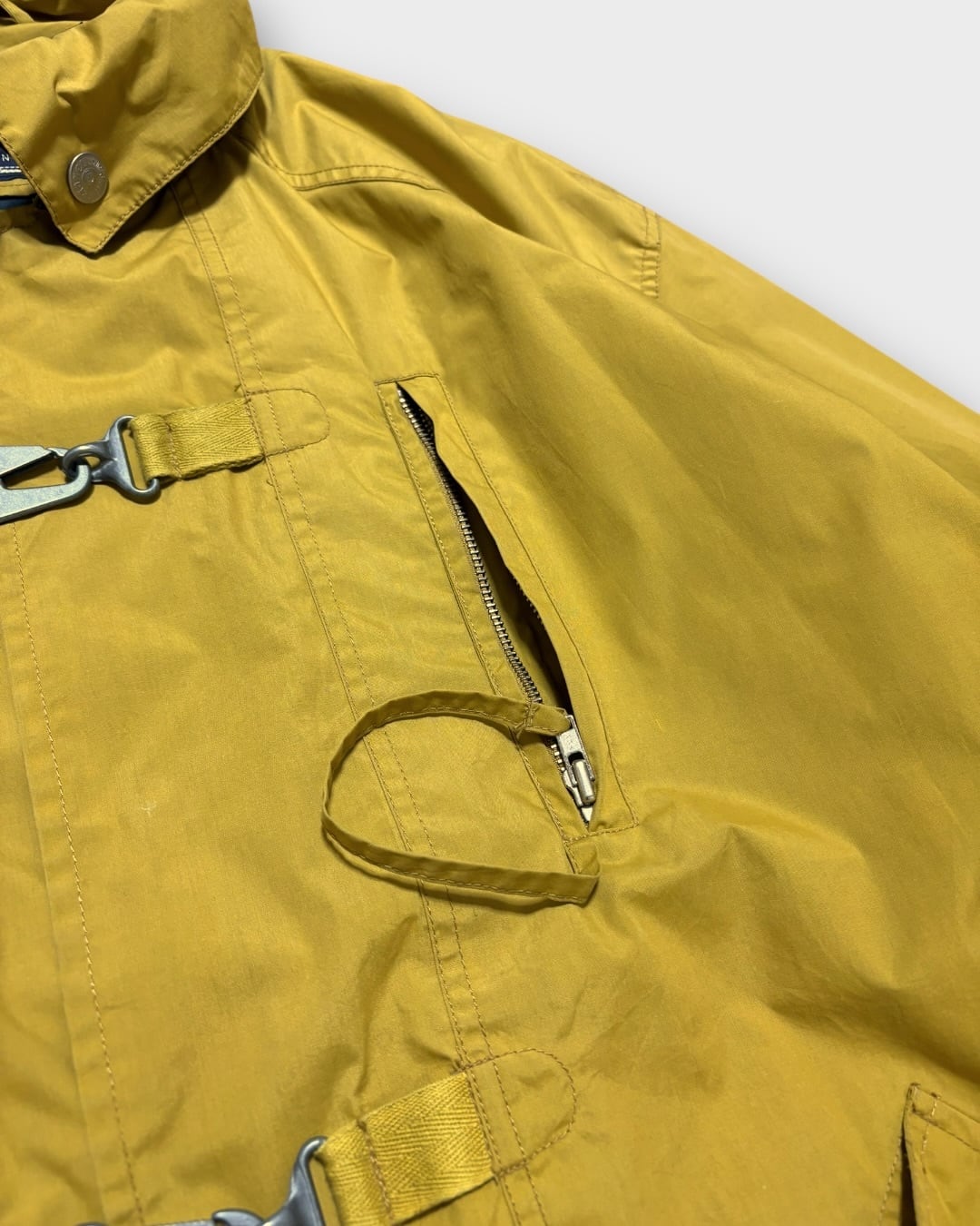 発色の良いイエローカラーに、フロントのメタルフックが特徴的なデザインの一着です。