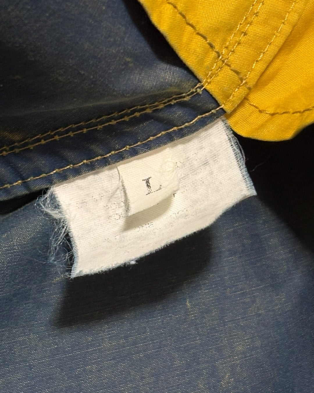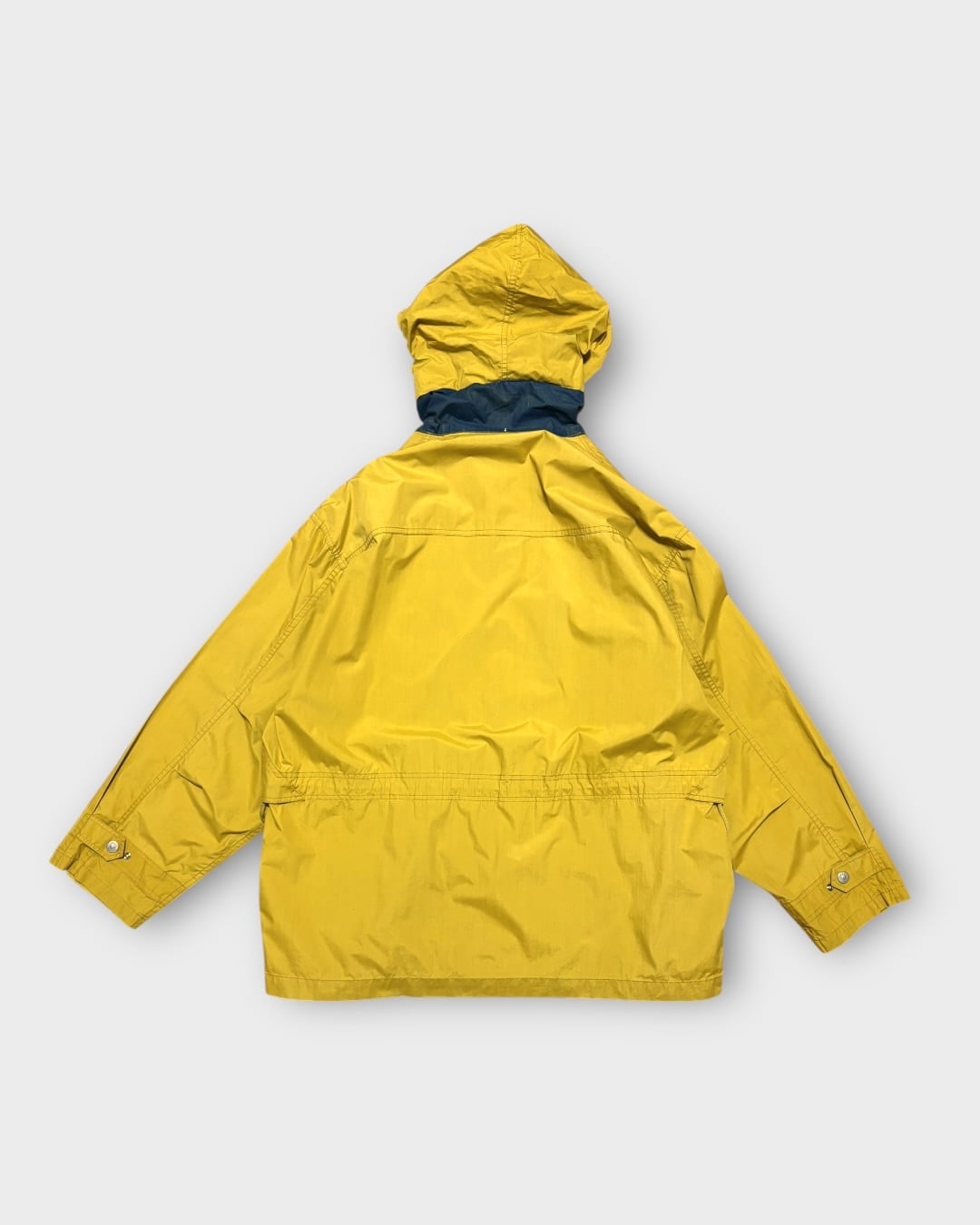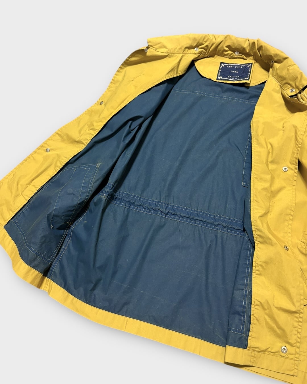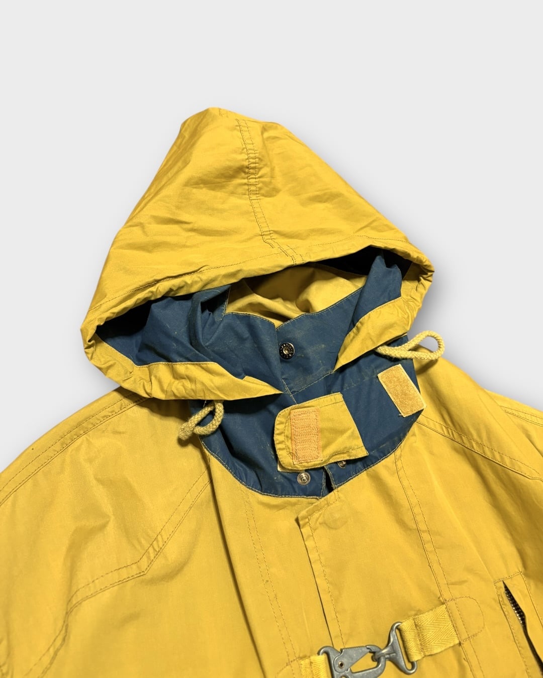 発色の良いイエローカラーに、フロントのメタルフックが特徴的なデザインの一着です。