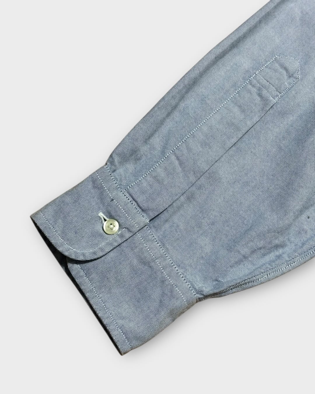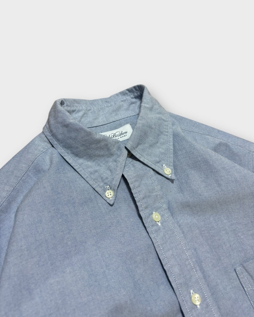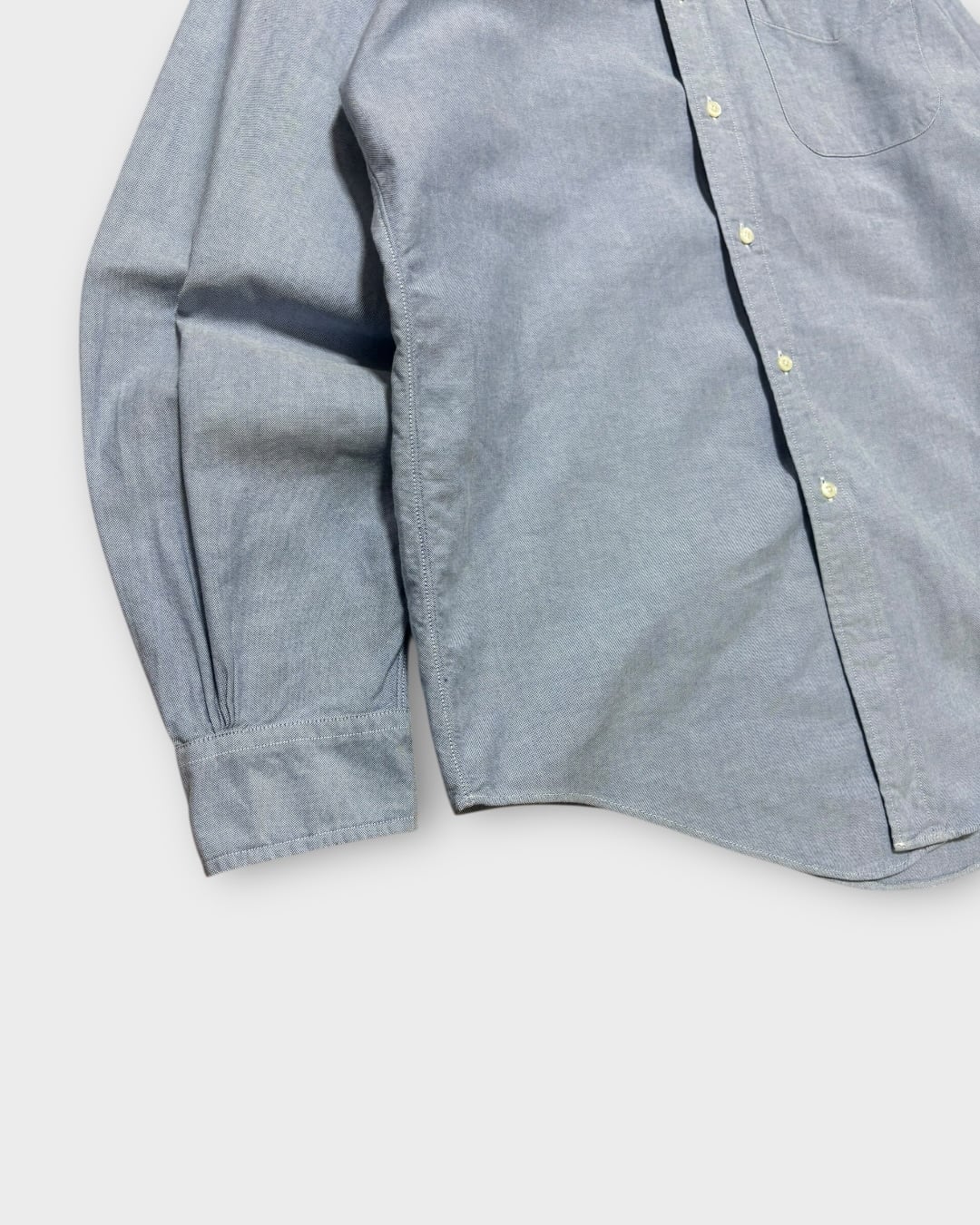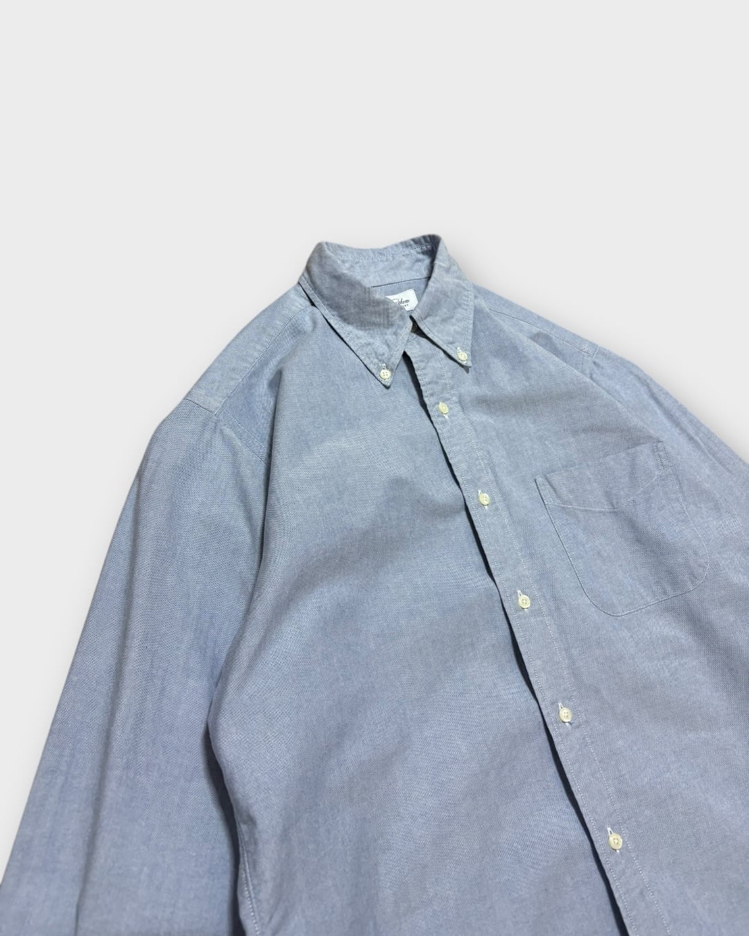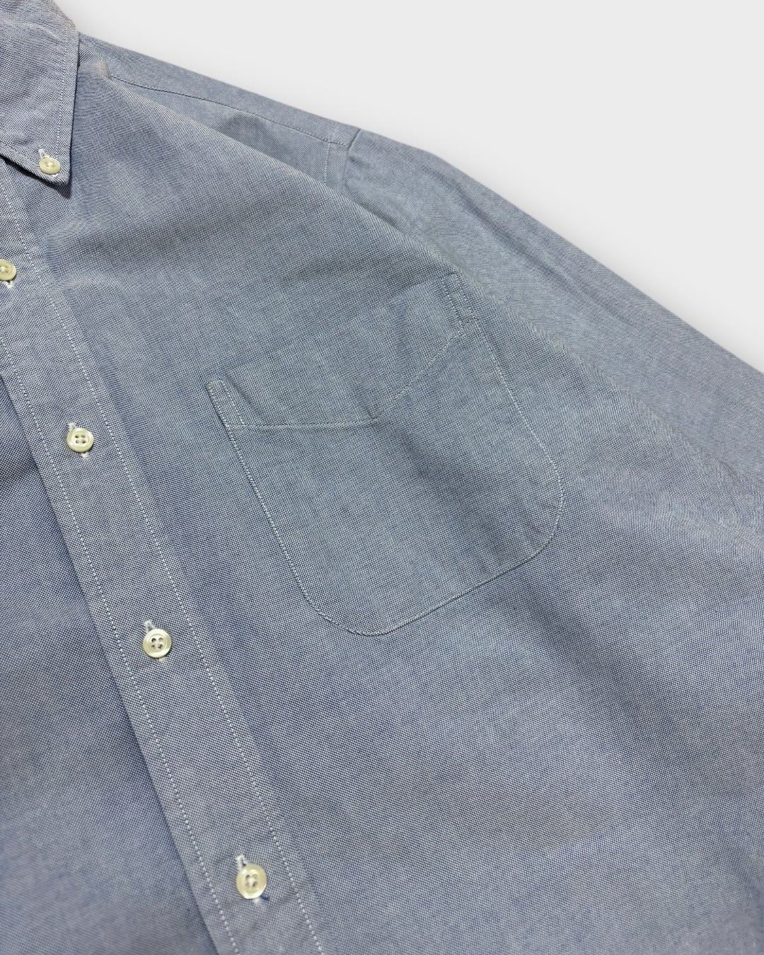 カラーは定番のサックスブルーで、オックスフォード独自の表情も相まって、無地でありながら奥行きのある見え方です。
