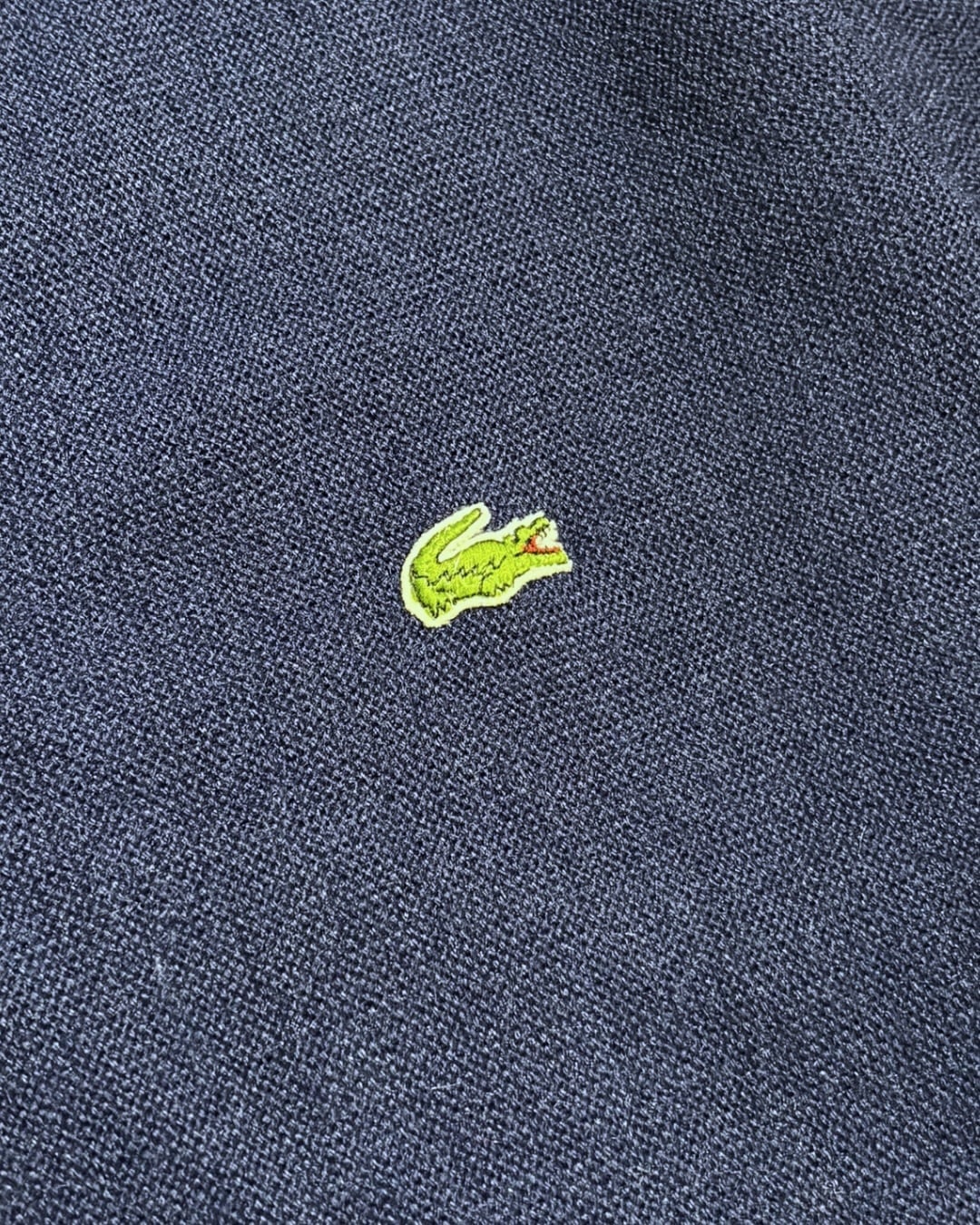 濃いネイビーの無地ボディに胸元のワニロゴが映えるデザインです。