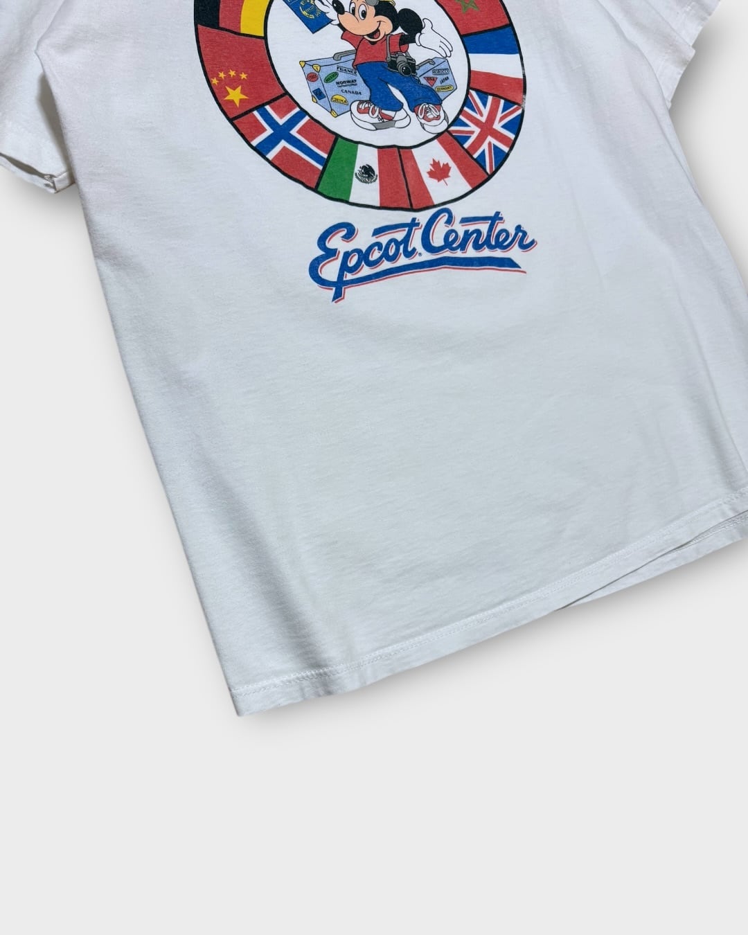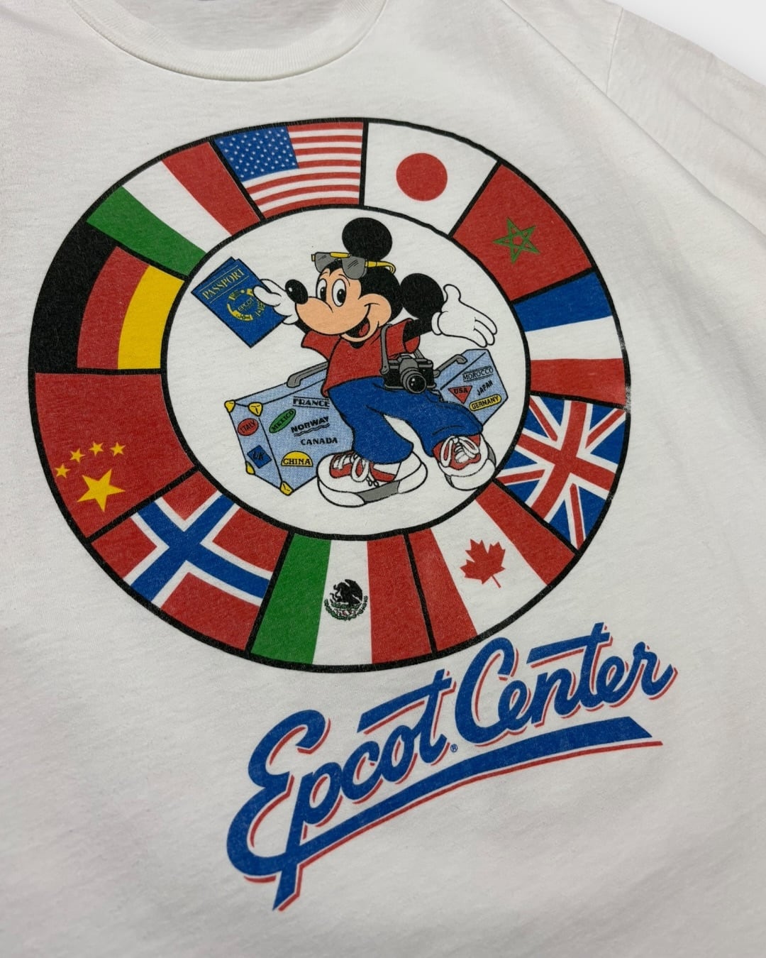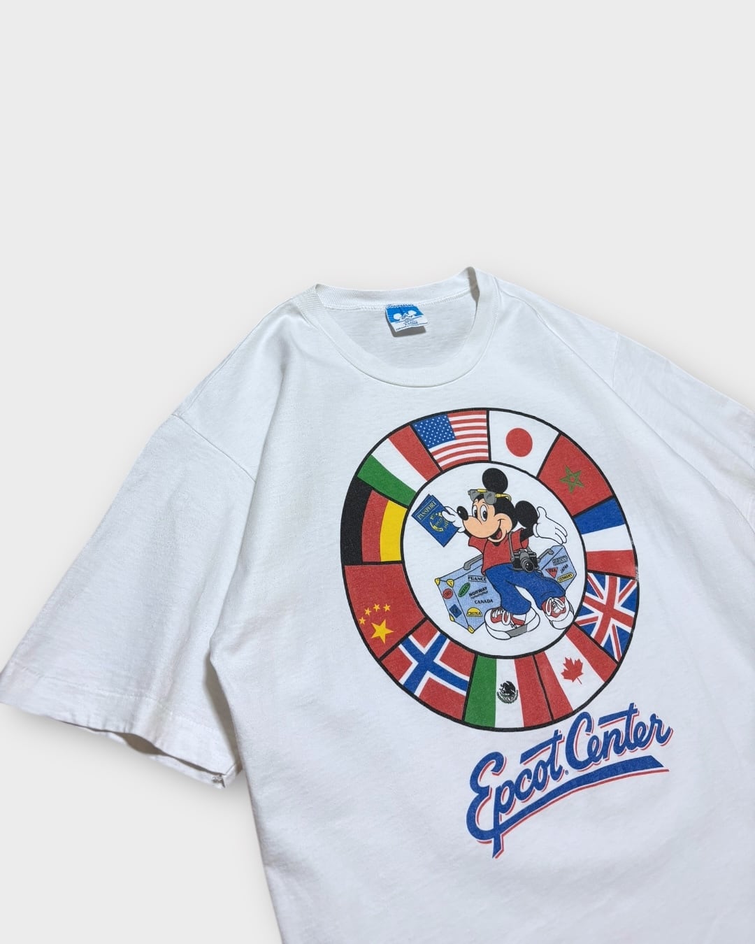 ホワイトボディに、各国の国旗を配したサークルグラフィックと、旅支度をしたミッキー、Epcot Centerのロゴが映える一枚です。