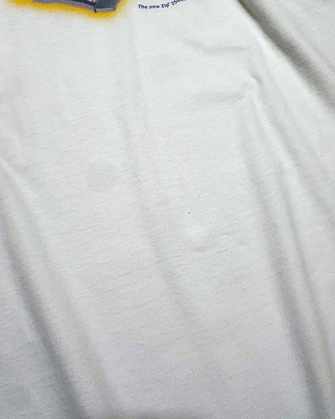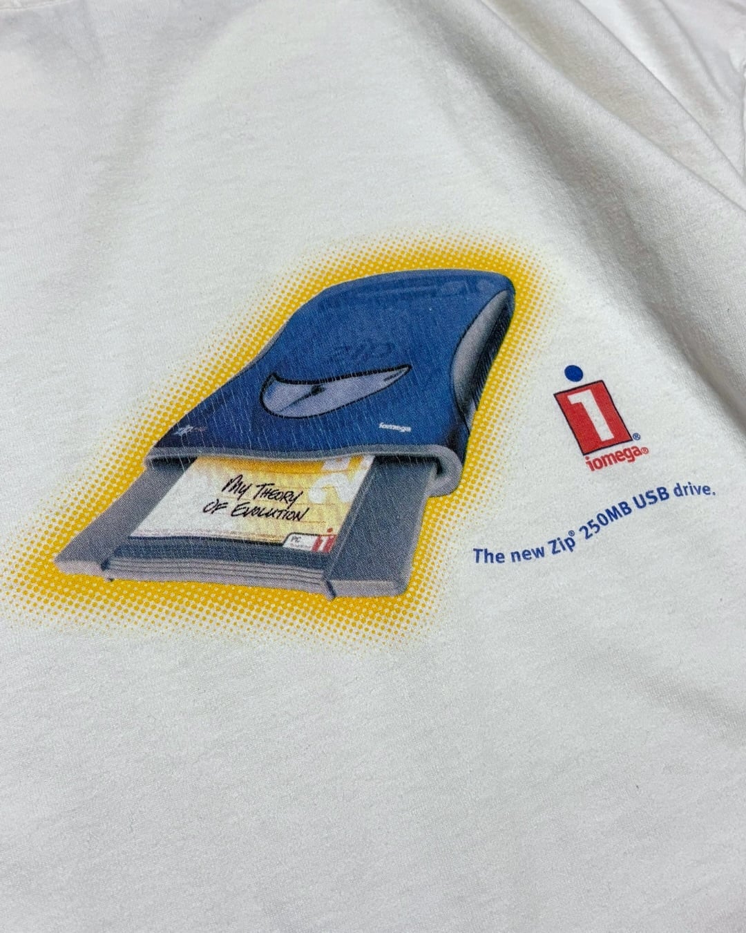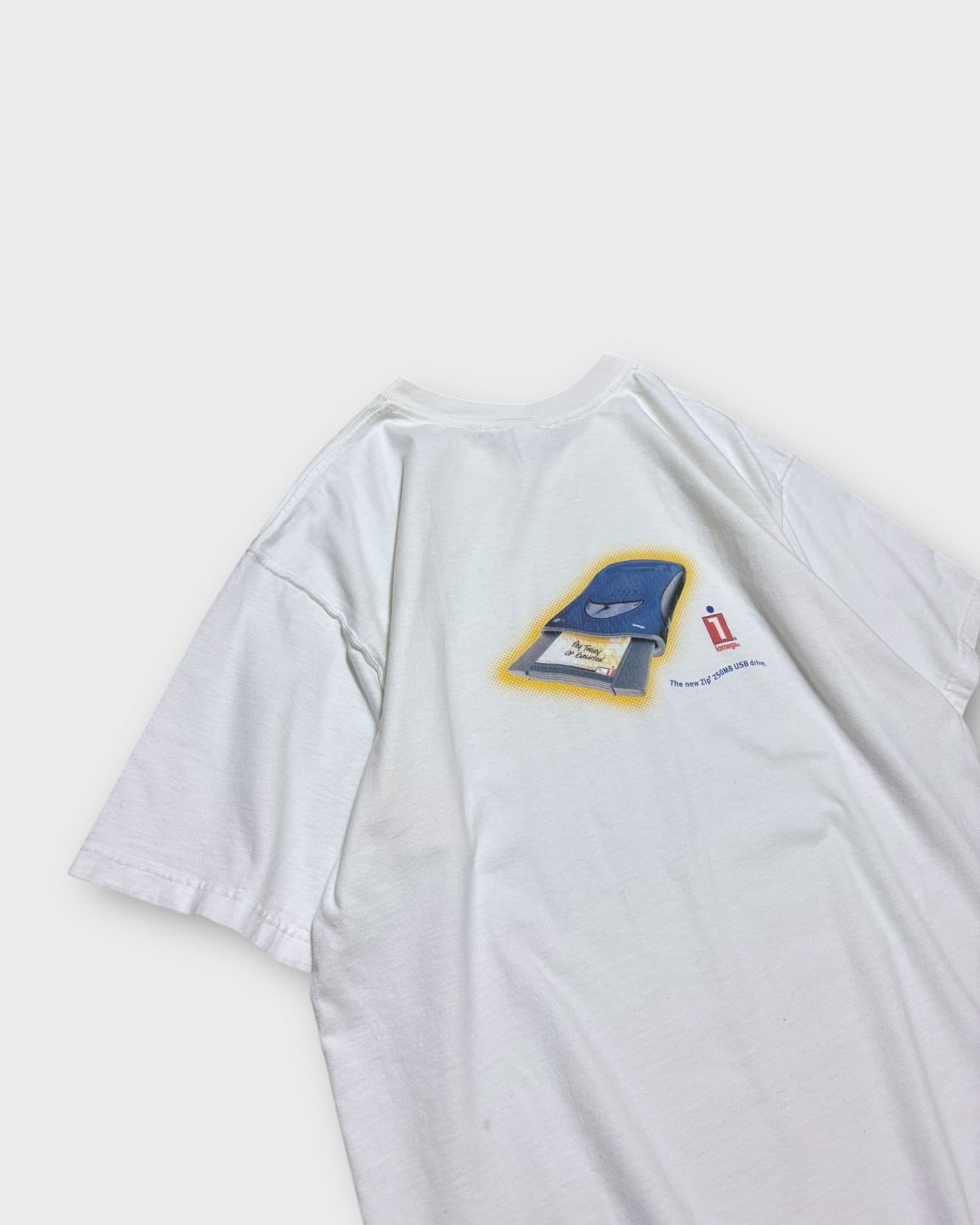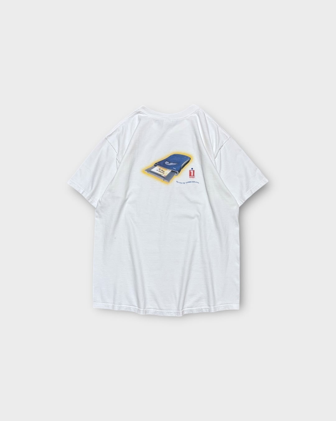 “iomega”のZip 250MB USB Driveをモチーフにした、2000’sのプリントTシャツ。