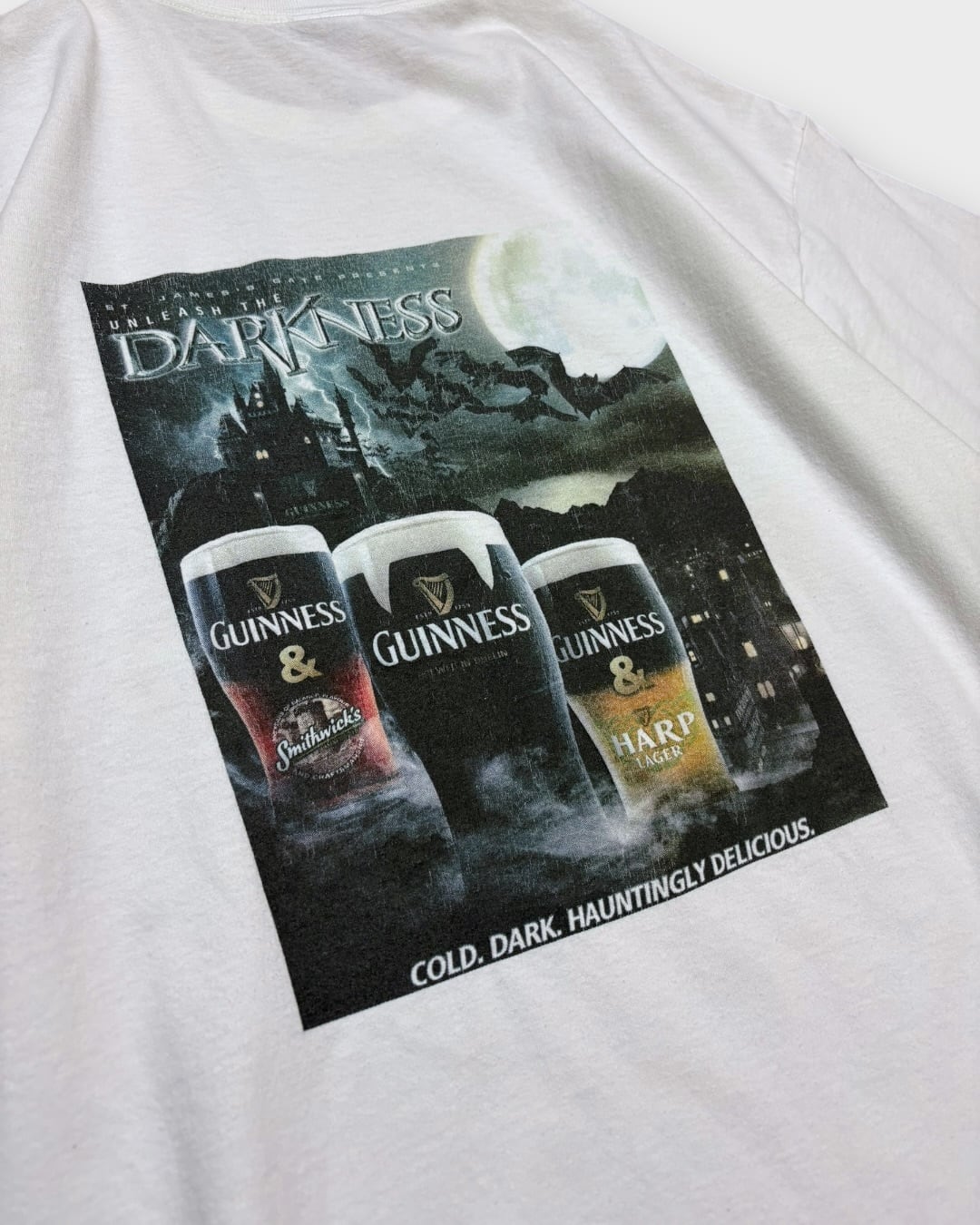月夜や城を思わせるダークトーンのビジュアルに、Guinness、Smithwick’s、Harpのグラスを重ねたデザインで、面白さがあります。