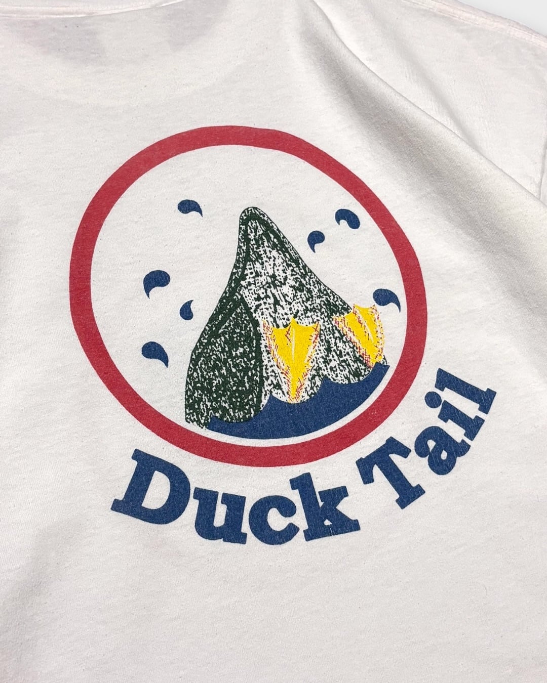 ホワイトの無地ボディに、フロントはブランドを象徴するRed Head、背面はそれをもじったDuck Tailが入る、遊びの効いた両面プリントです。