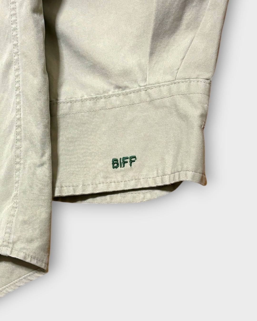 淡いベージュカラーの無地ボディに、エポレットや両胸のフラップポケットが映える一枚です。