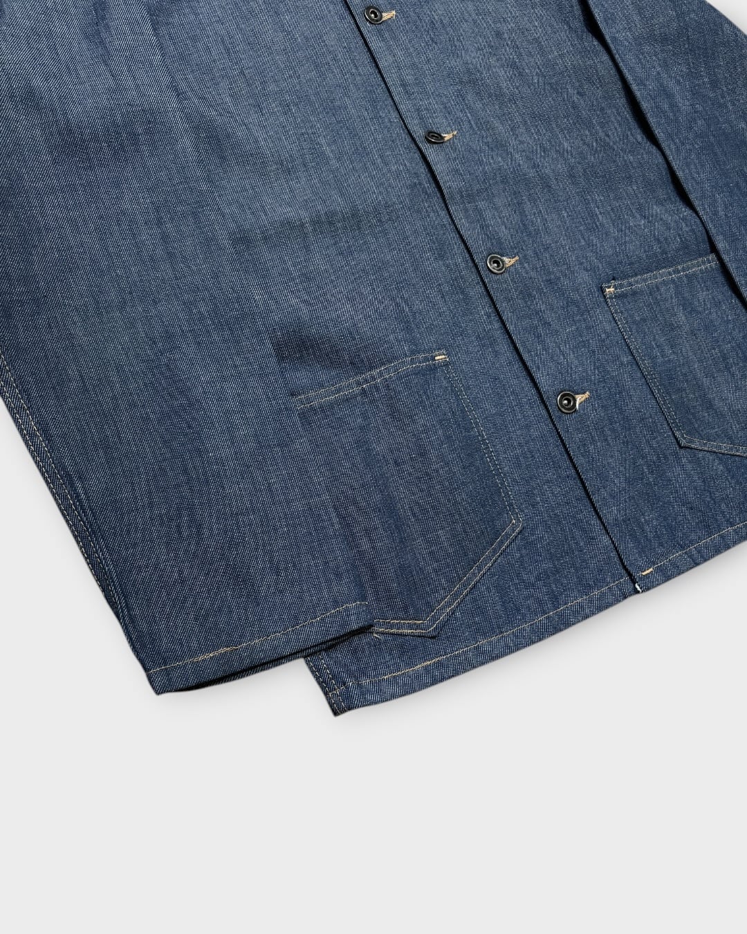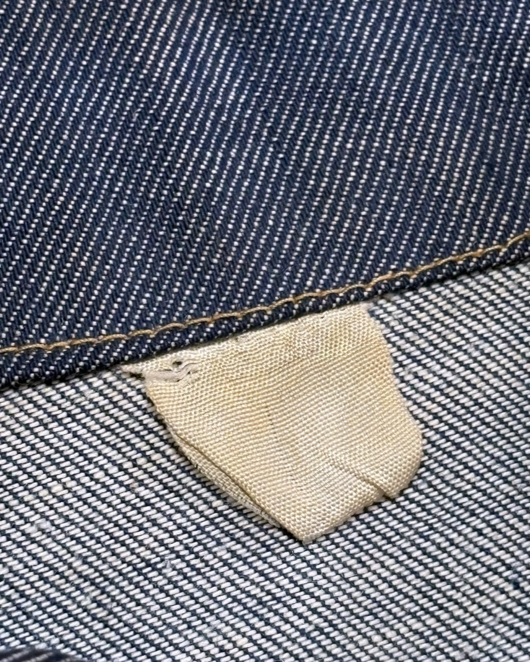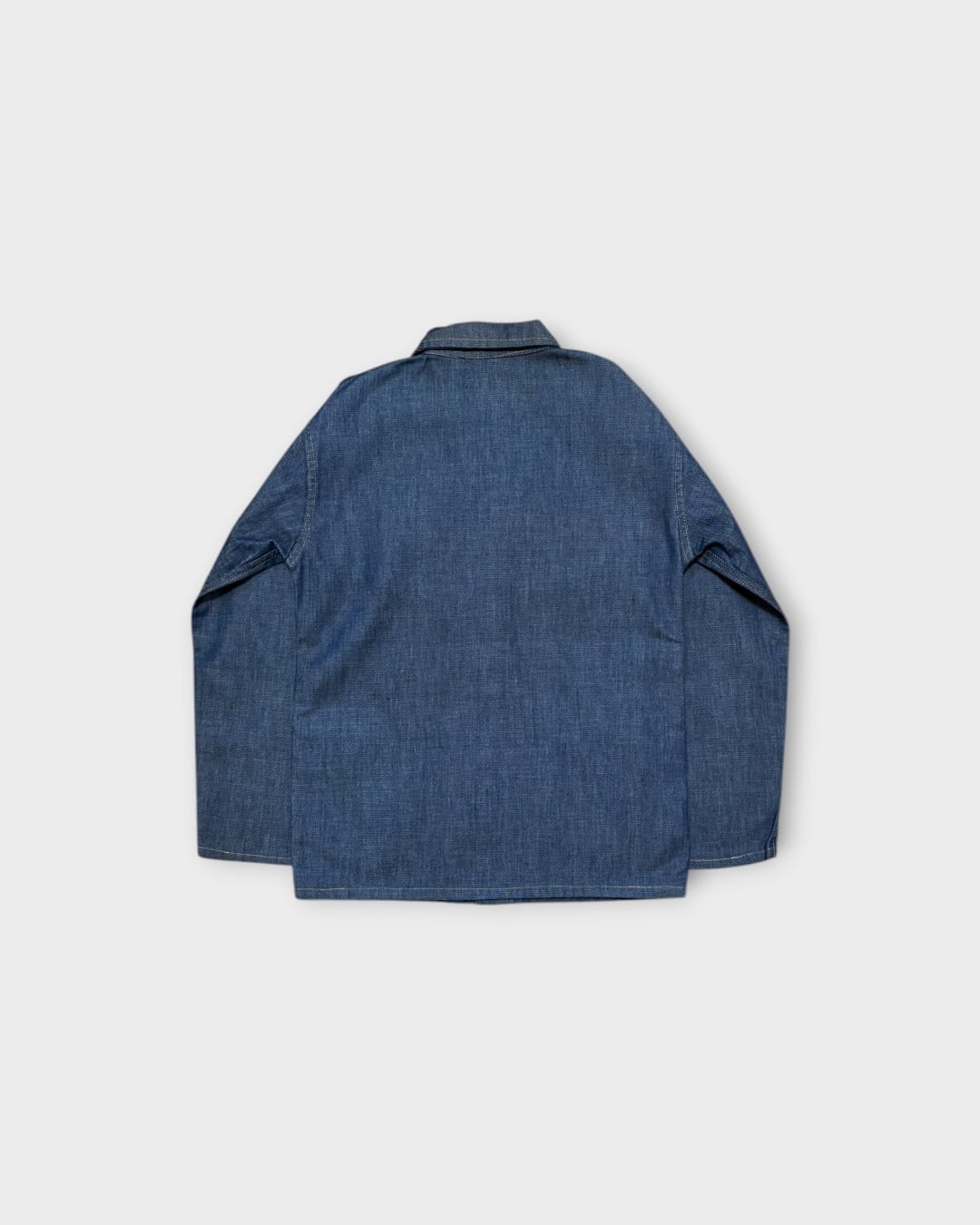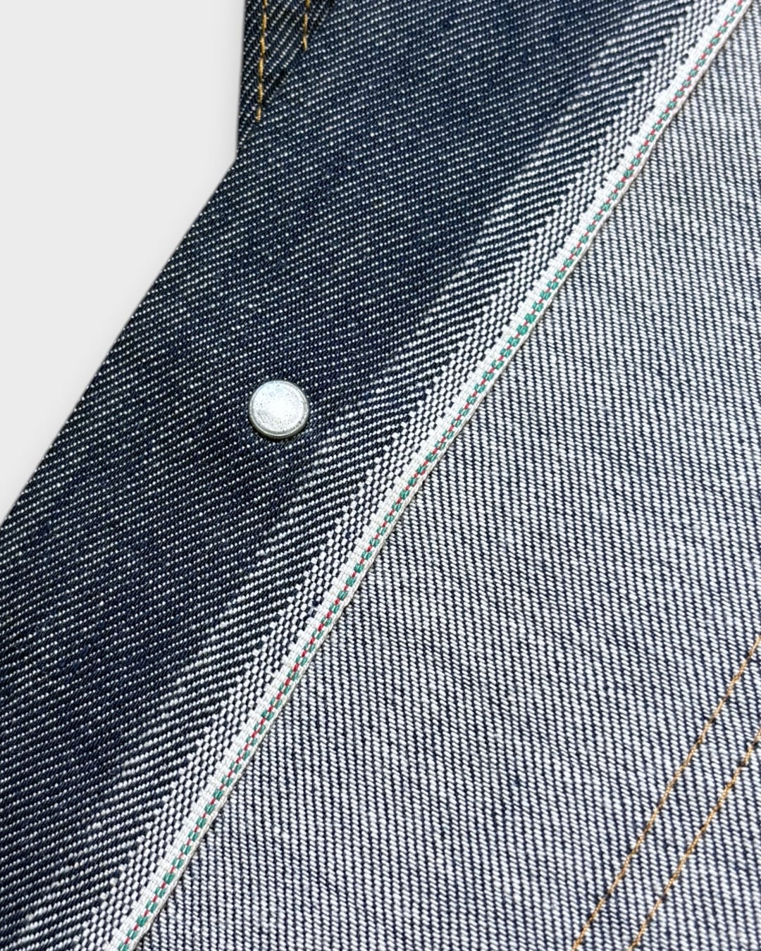 濃いインディゴの無地ボディに、ライトオンスのデニムを使用した一着です。