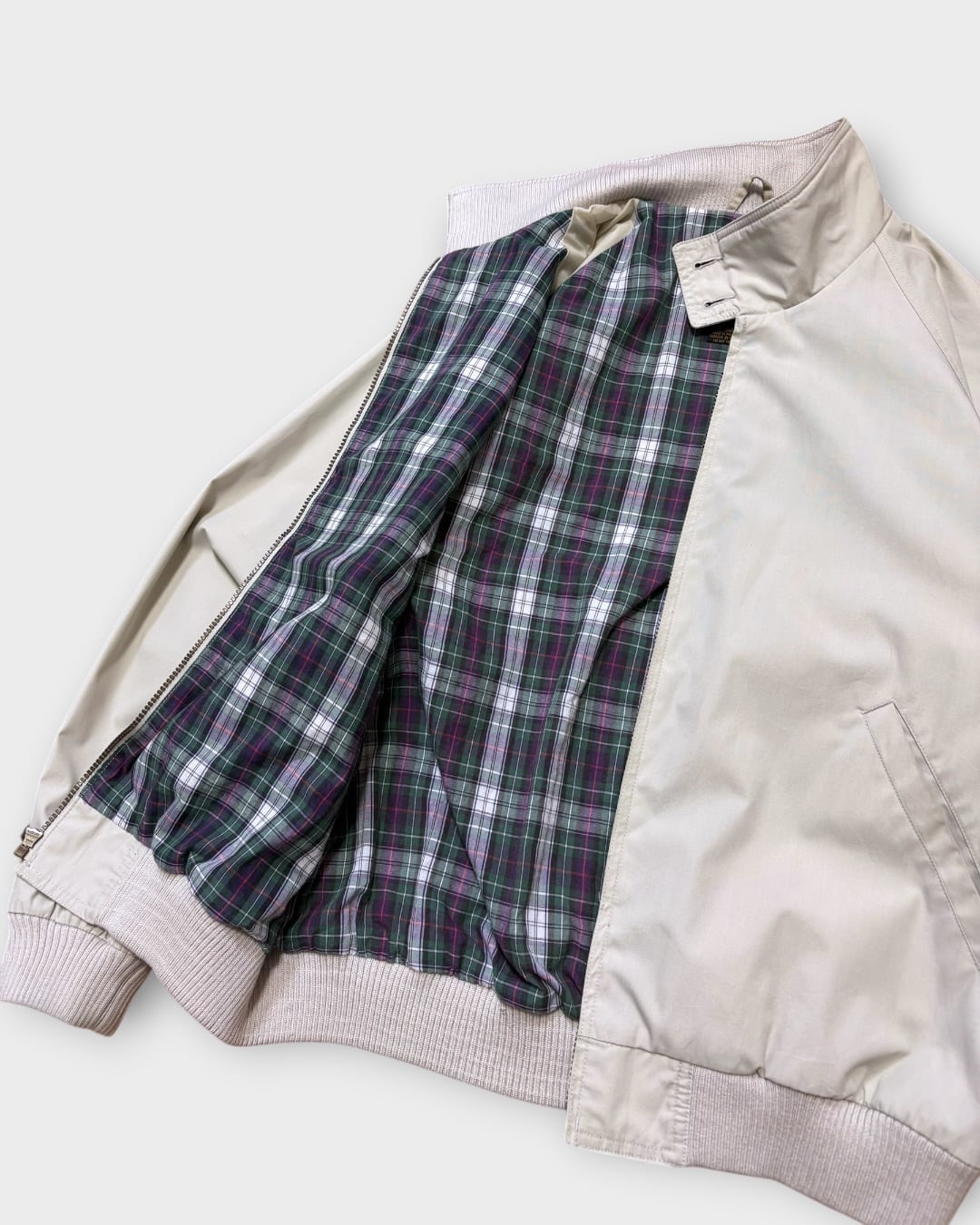 やわらかなライトベージュの無地ボディに、グリーンベースのタータンチェック裏地を合わせた一着です。