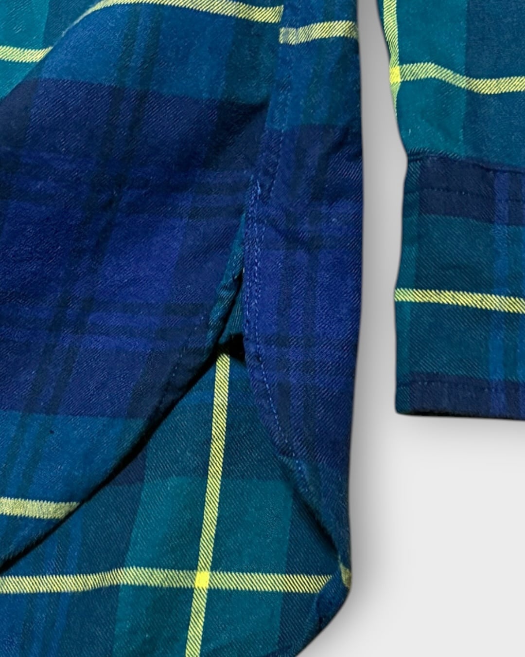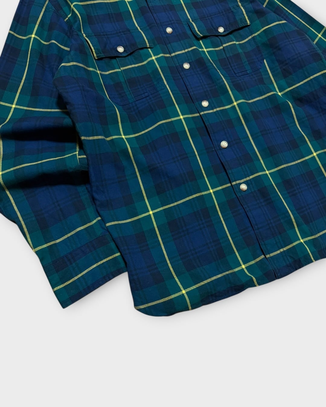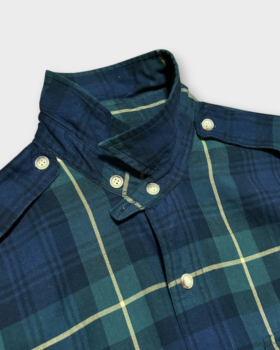 ネイビーとグリーンをベースに、イエローのラインが効いたクラシックなタータンチェック柄が印象的な一着です。