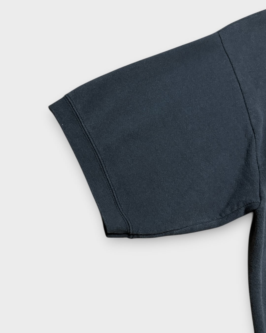 フェードしたブラックの無地ボディに、首元のガゼットが映える一枚です。