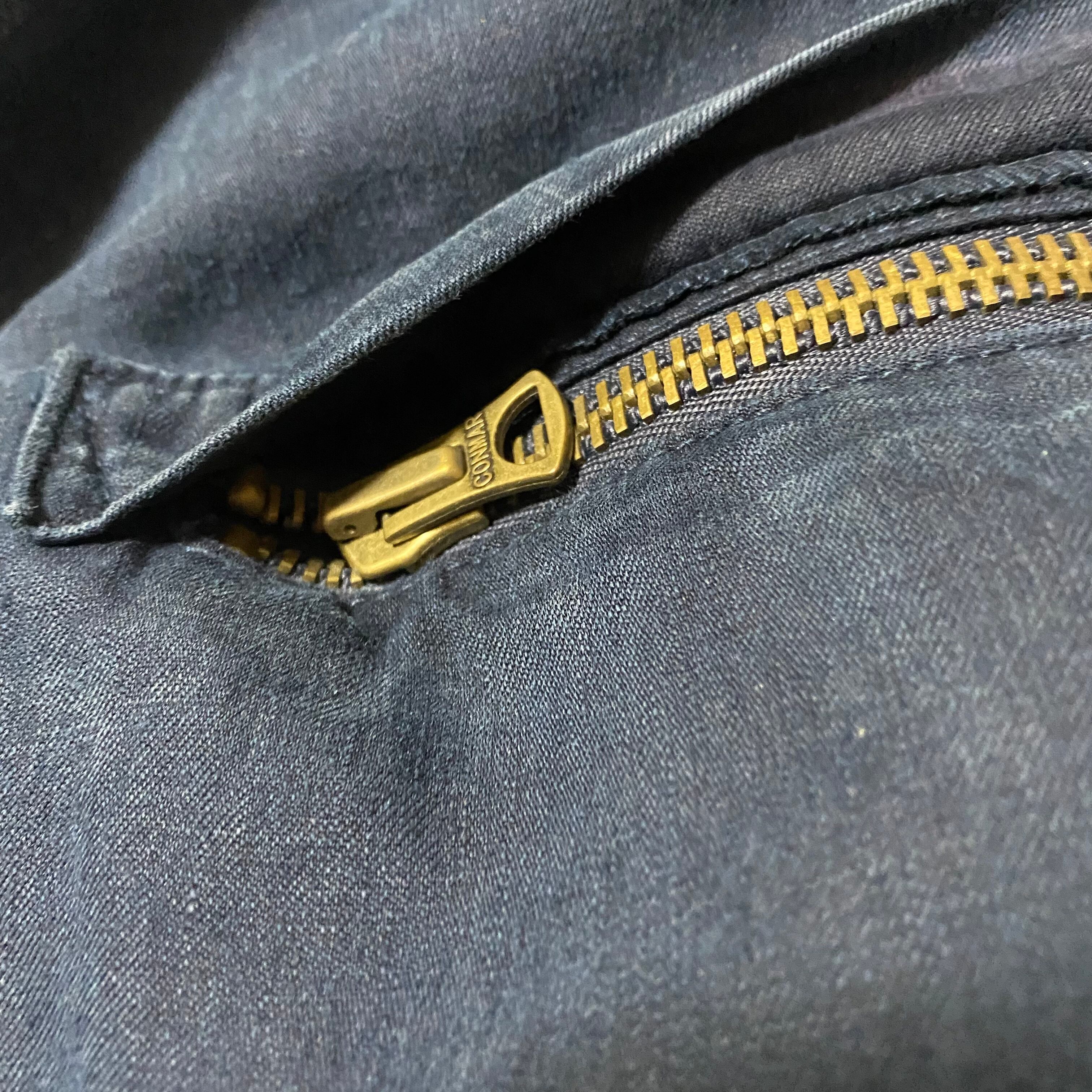 リネン素材を使ったミリタリージャケット随所に配置された立体ポケット、グリーンのチンストラップ、リアルレザーの使われたパイピング、ダブルジップのCOMMER、背面に付けられたジッパーポケット