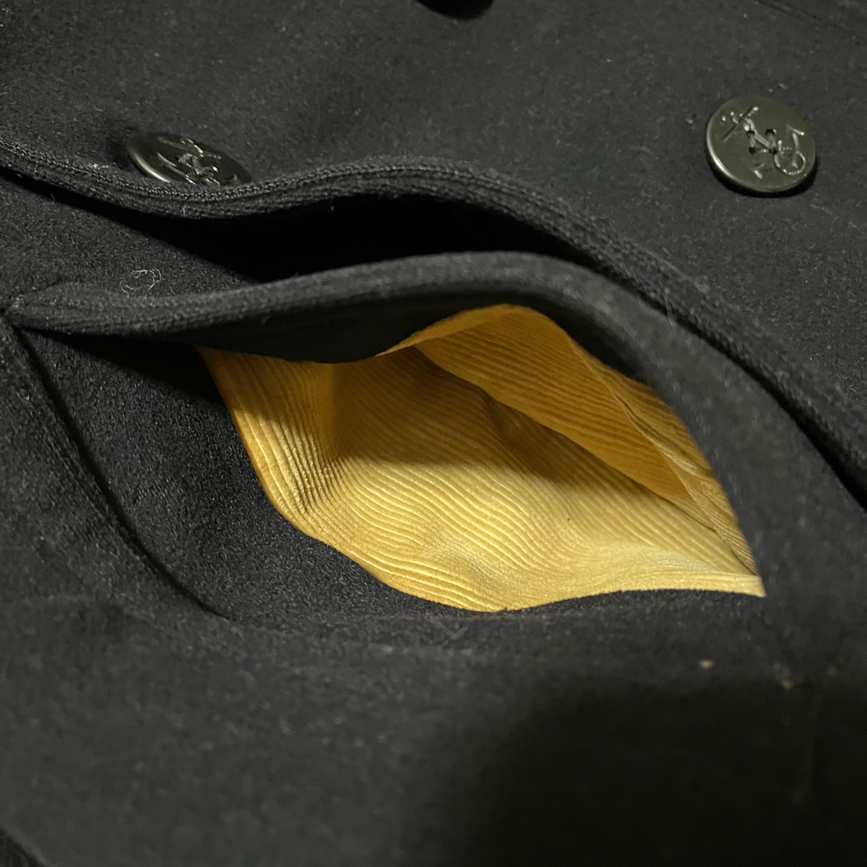 ポケット裏地にはベージュのコーデュロイが使用されているのも古い年代のPコートならではなディテールです。