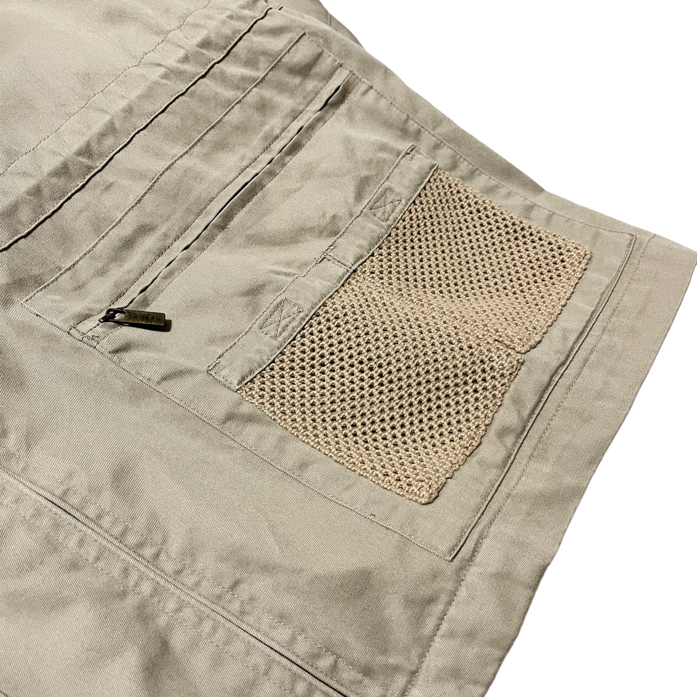 多数配されたポケット、そしてメッシュ素材のポケットや裏地、ベンチレーションにウエストドローコード、変形の引手金具などなど