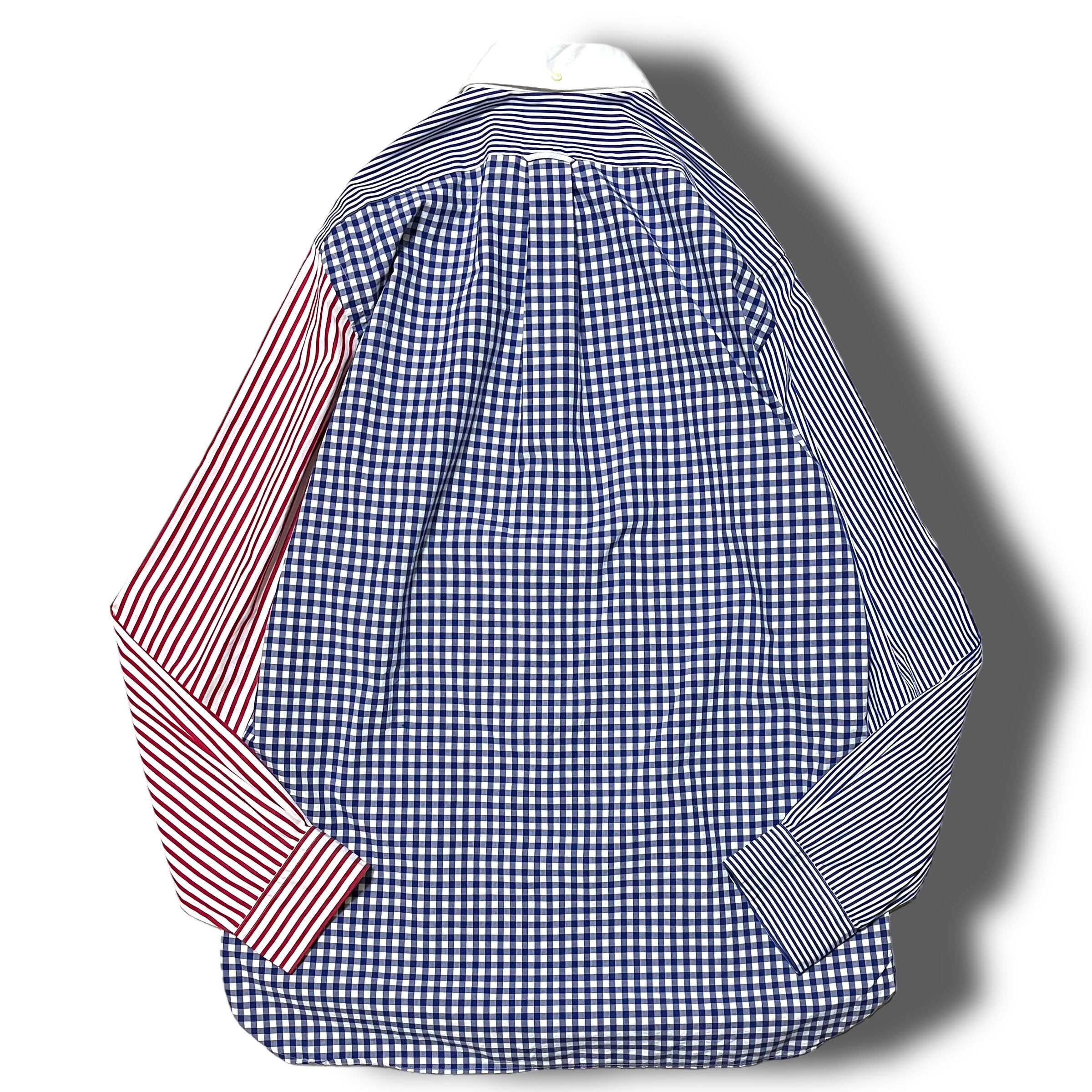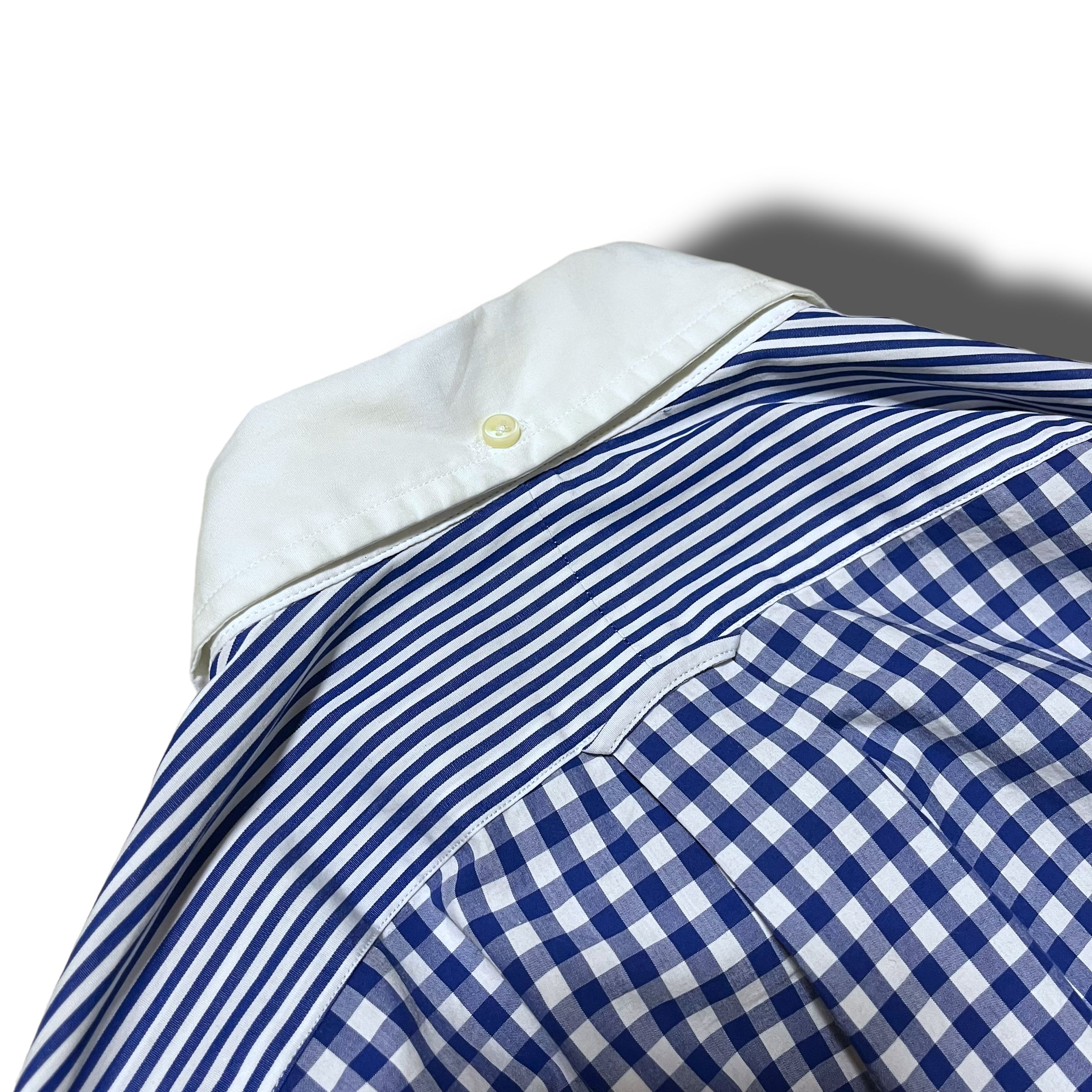 様々なピッチのストライプと背面にはギンガムチェックの生地が使われた遊び心溢れる1枚!