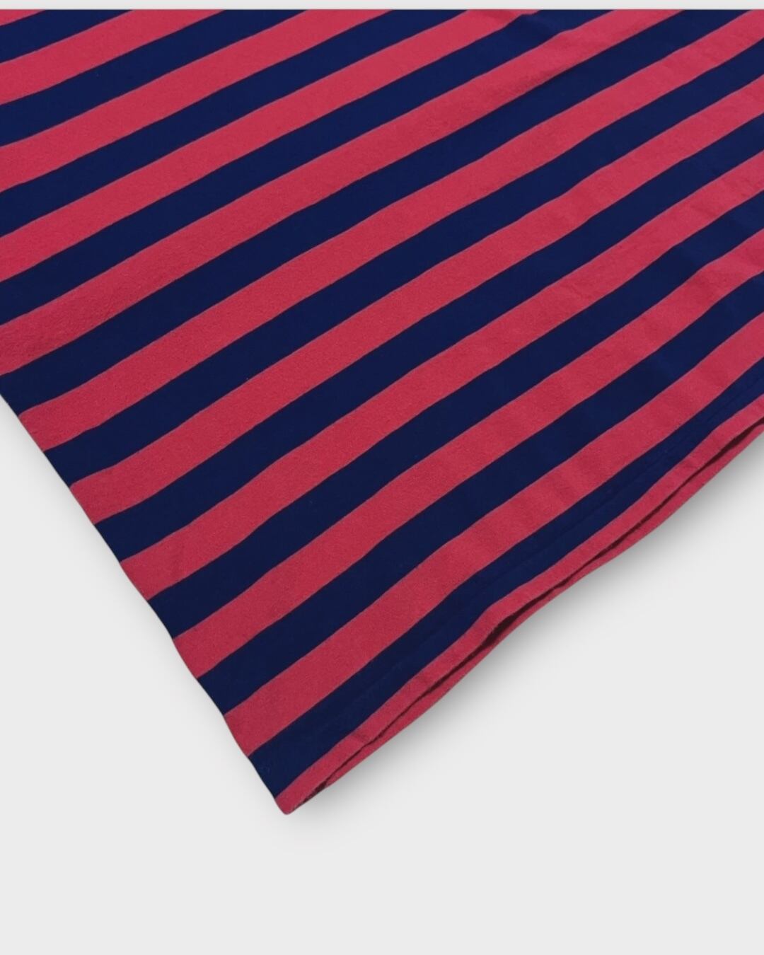 くすんだネイビーとレッドのコントラストが目を引く好配色で、シンプルながらスタイリングのアクセントになる一着です。