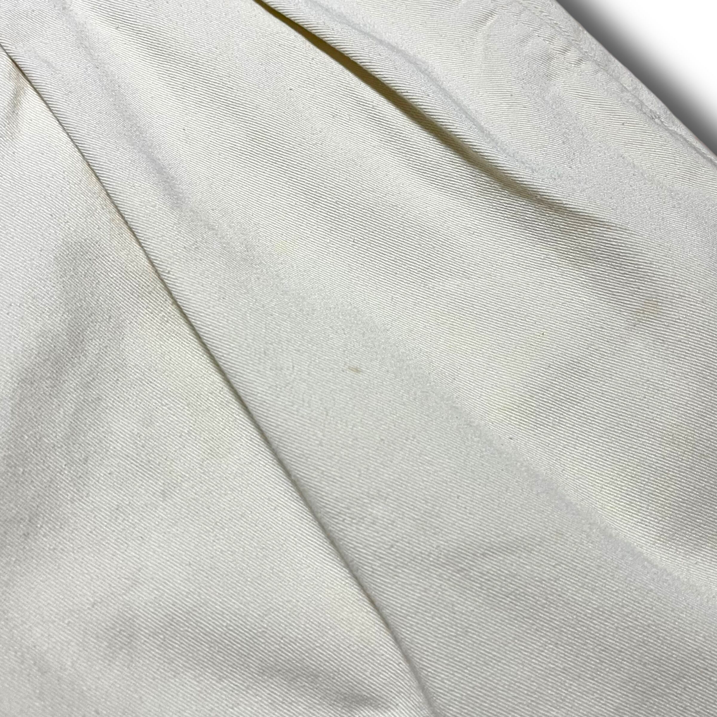 ベルトループの付かないベルトレス、サイドまでぐっと伸びた持ち出しにウエストバックル、フロントボタンフライ、インプリーツのツータック、しっかりとした100%コットンのツイル生地などなど嬉しいディテールの詰まった1枚です。