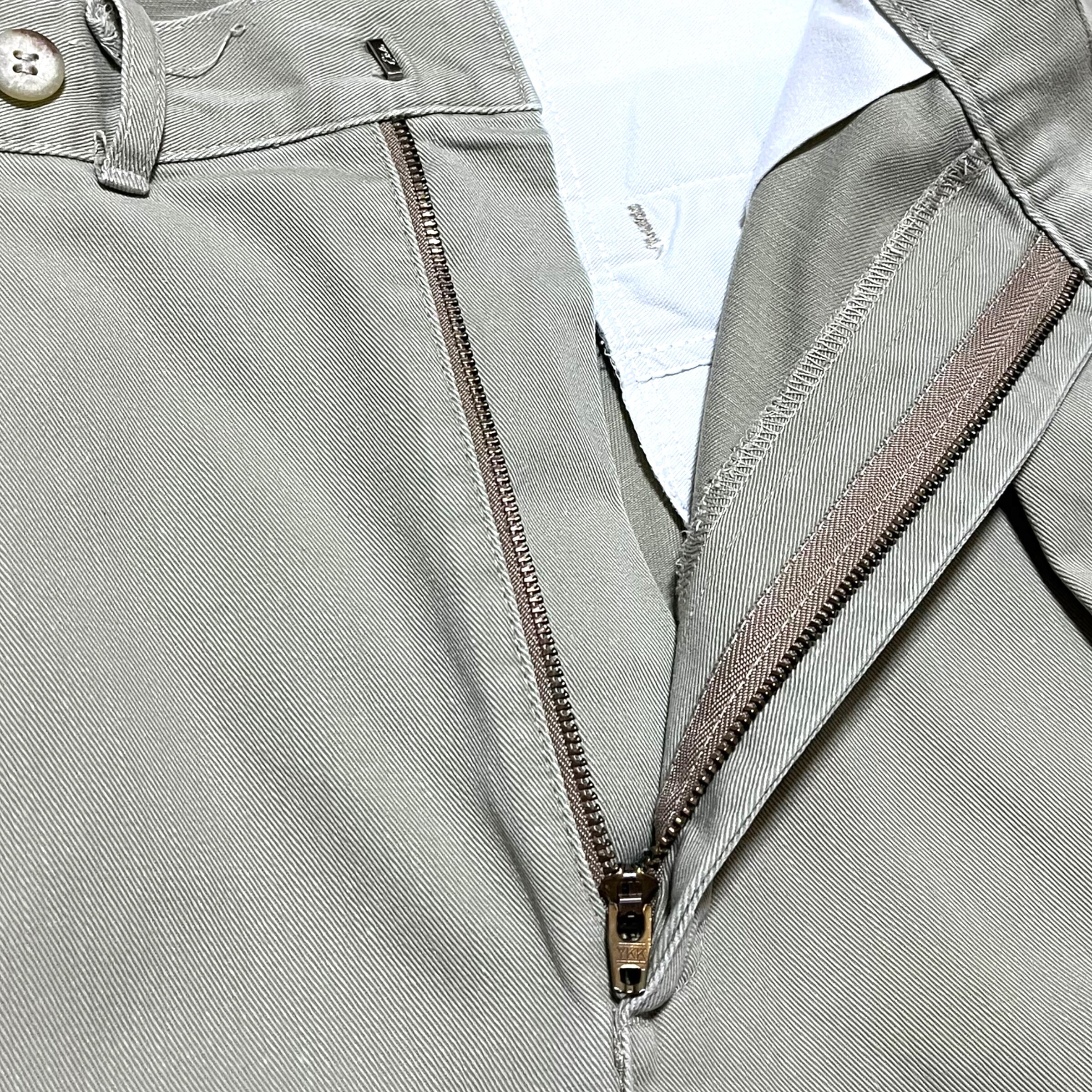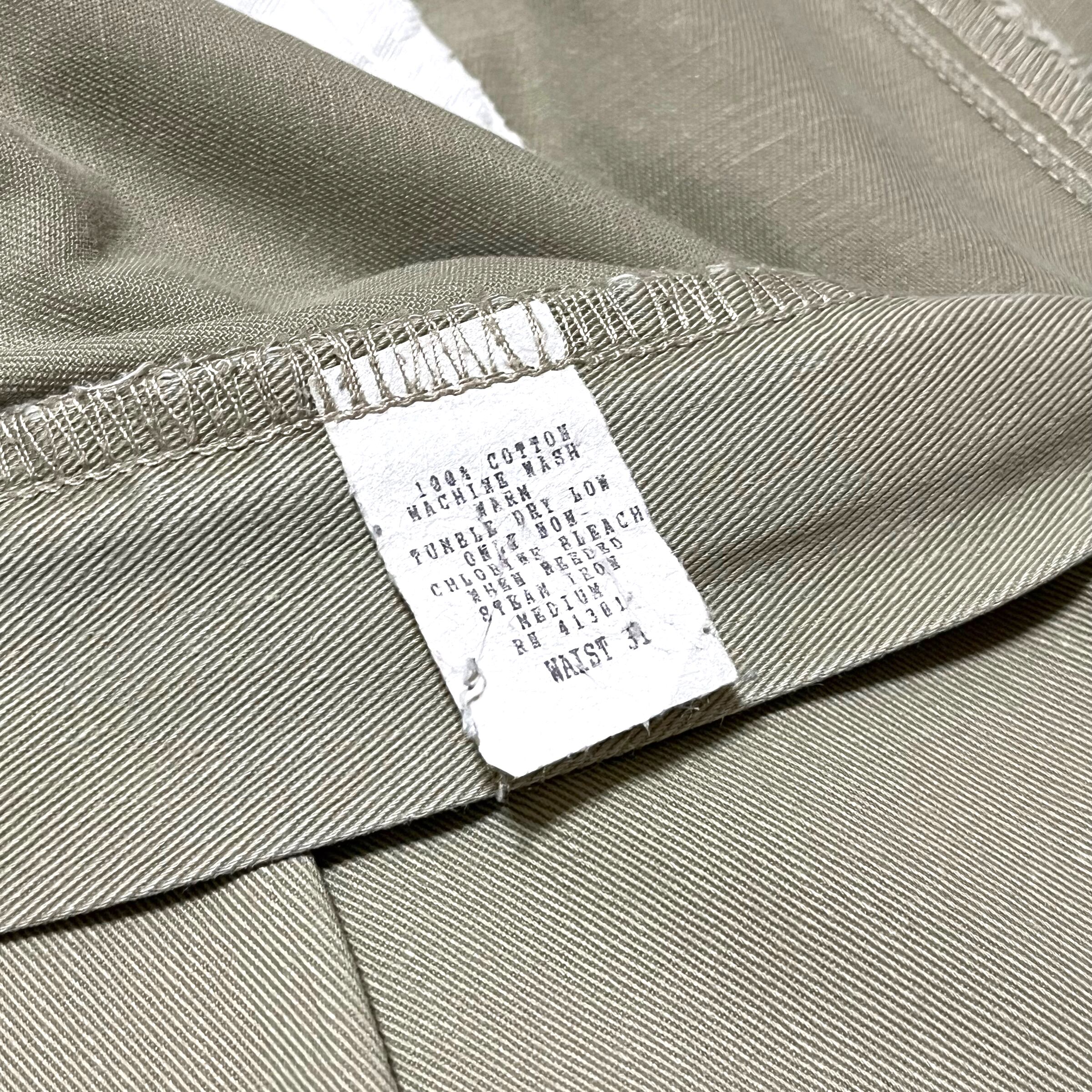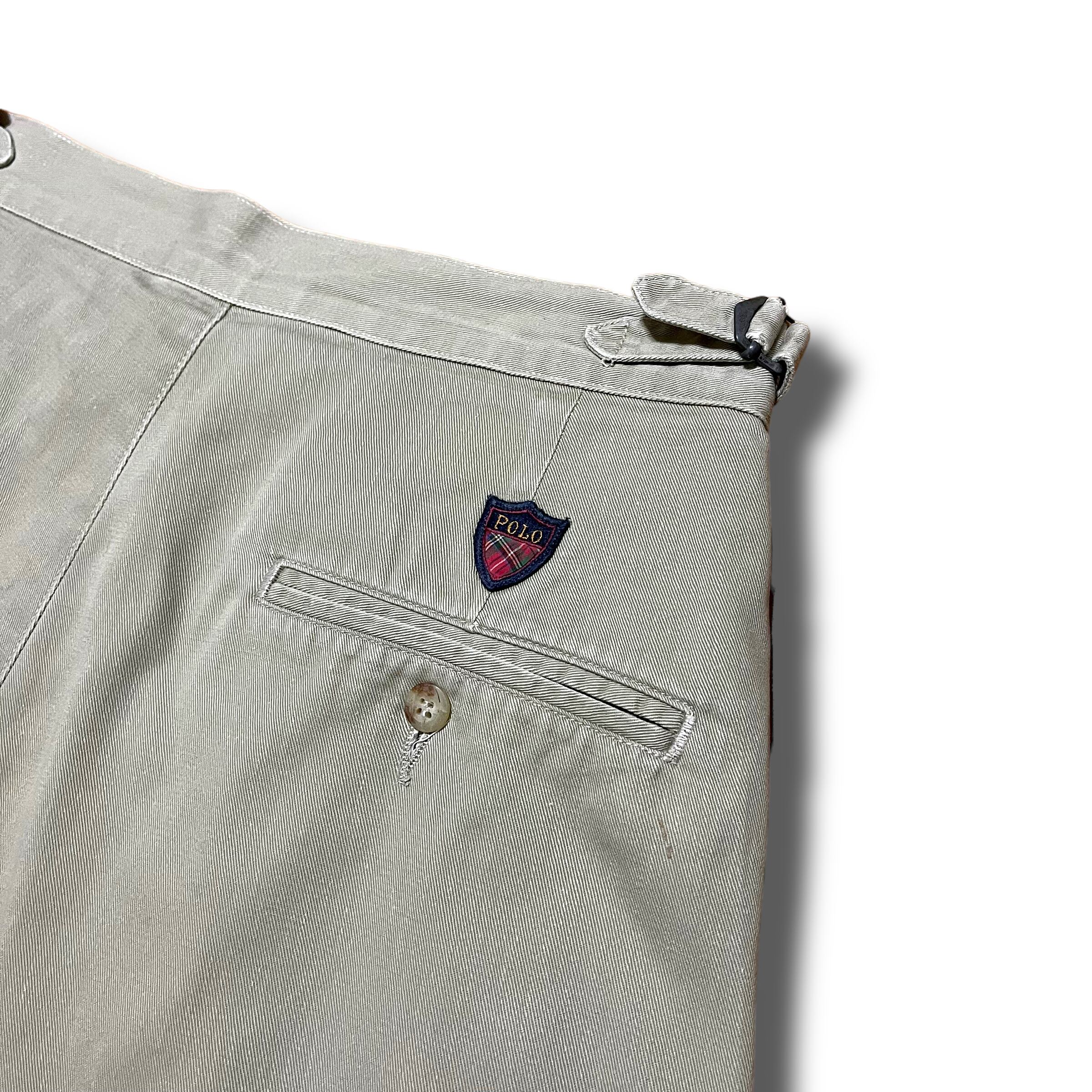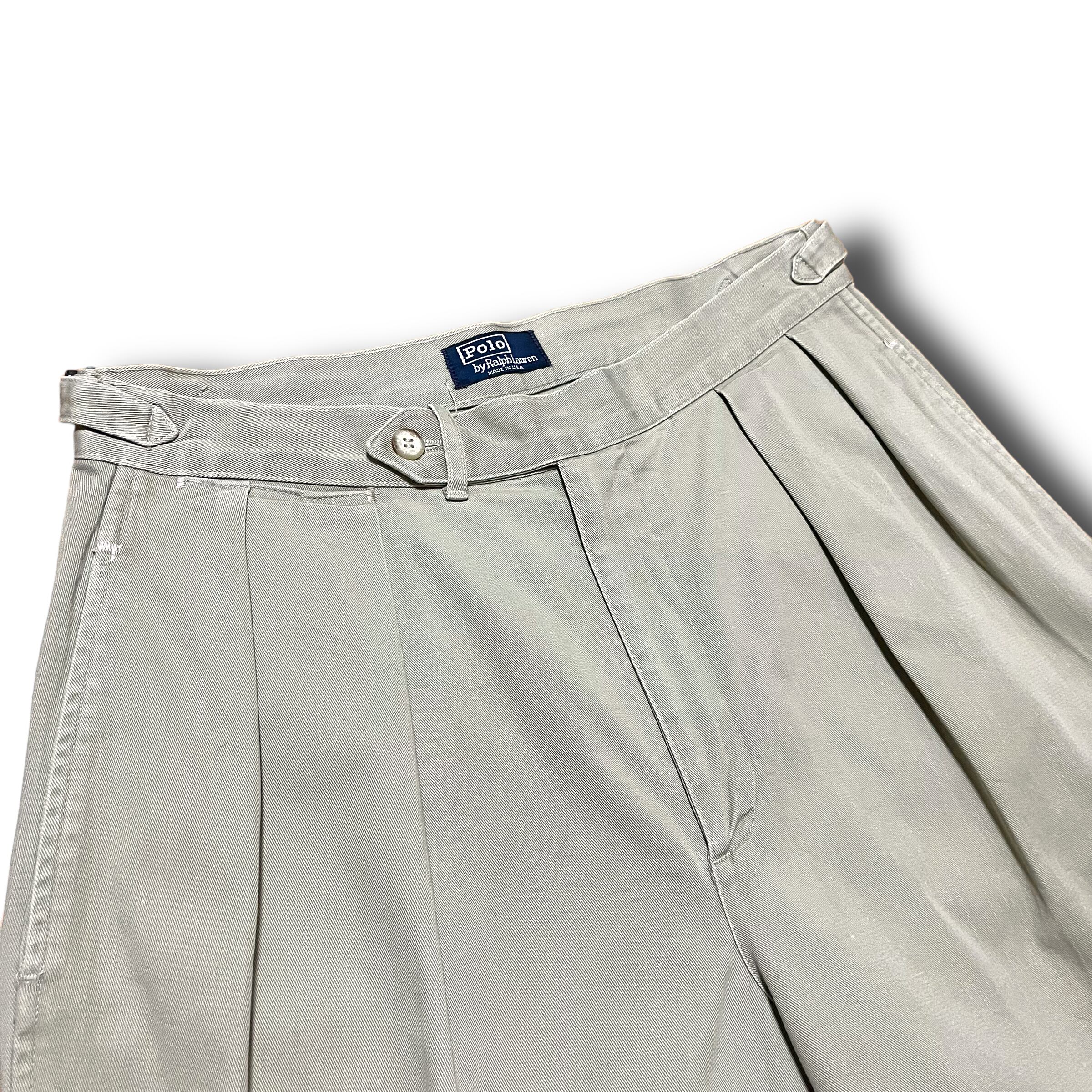 ベルトループの付かないベルトレス、サイドまでぐっと伸びた持ち出しにサイドアジャスター、インプリーツのツータック、1990年代のRalph Laurenのアメリカ製生地で見られるツイル生地などなど嬉しいディテールの詰まった1枚です。