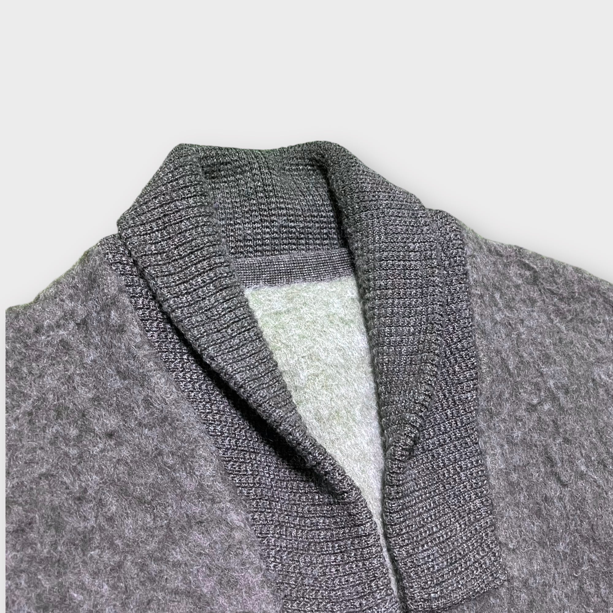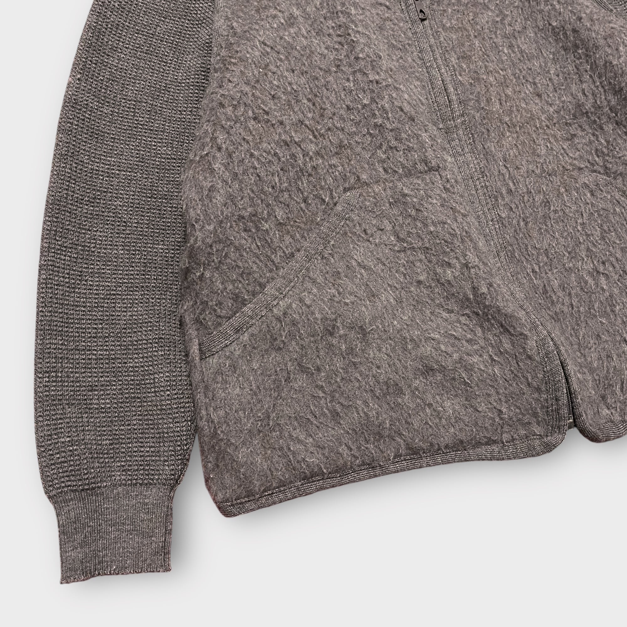 モヘアのような厚みのある起毛したボディにワッフル編みの袖の切り替えがされたデザインカーディガン