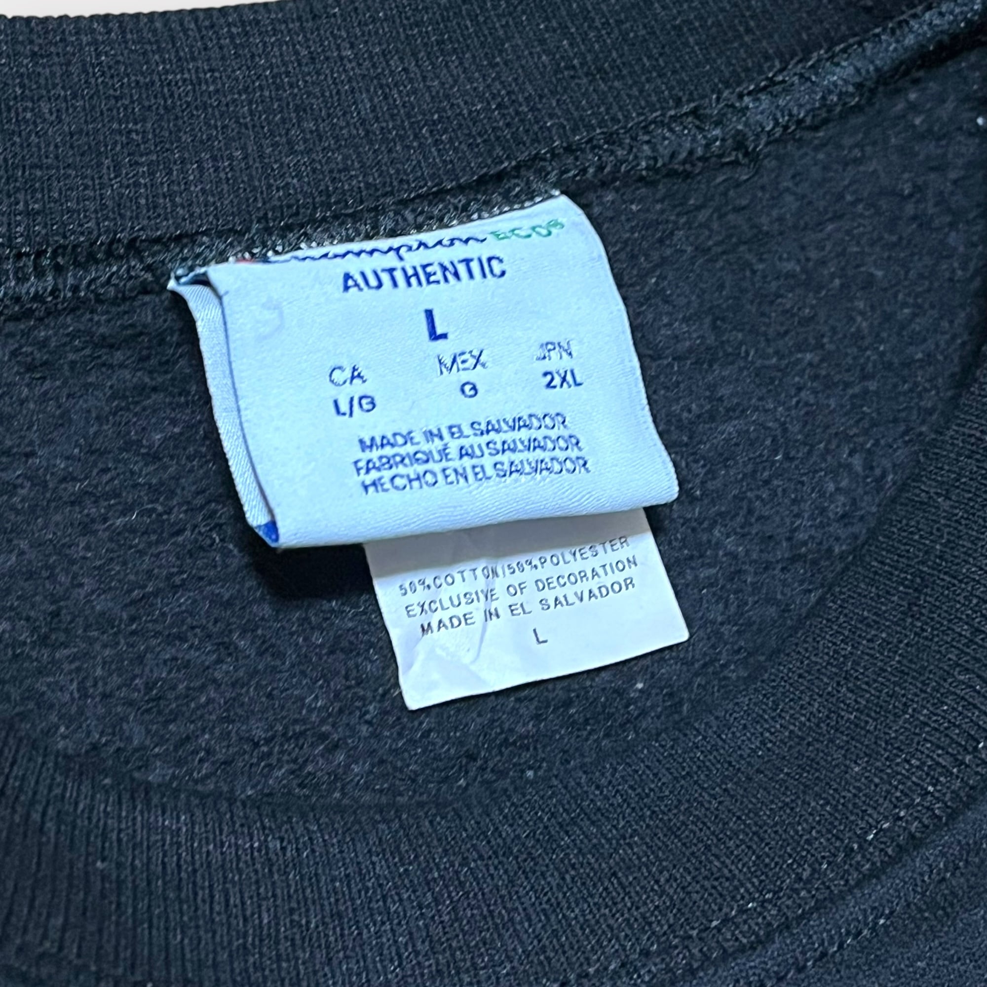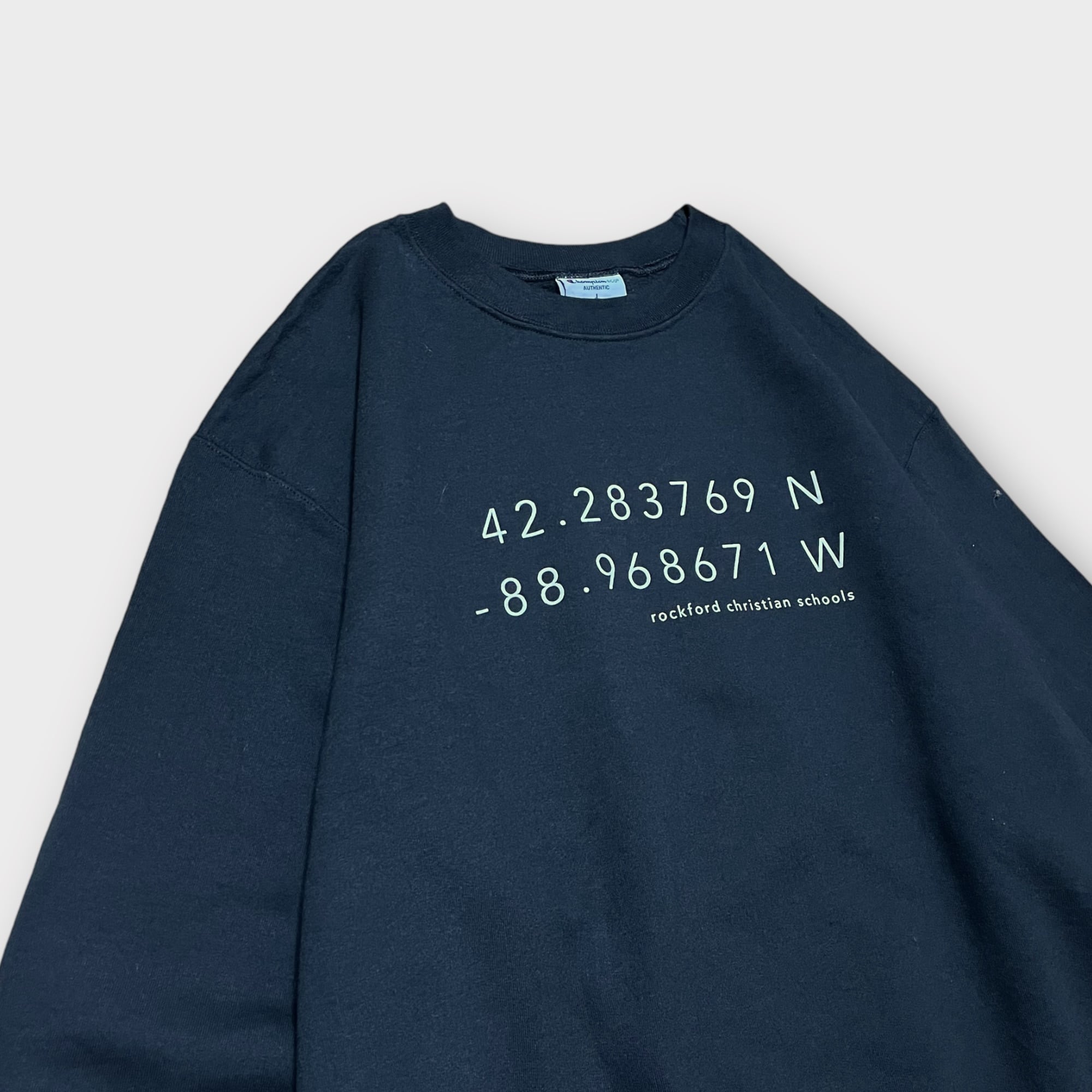 チャンピオンのブラックボディに同校の緯度と経度がプリントされた1枚