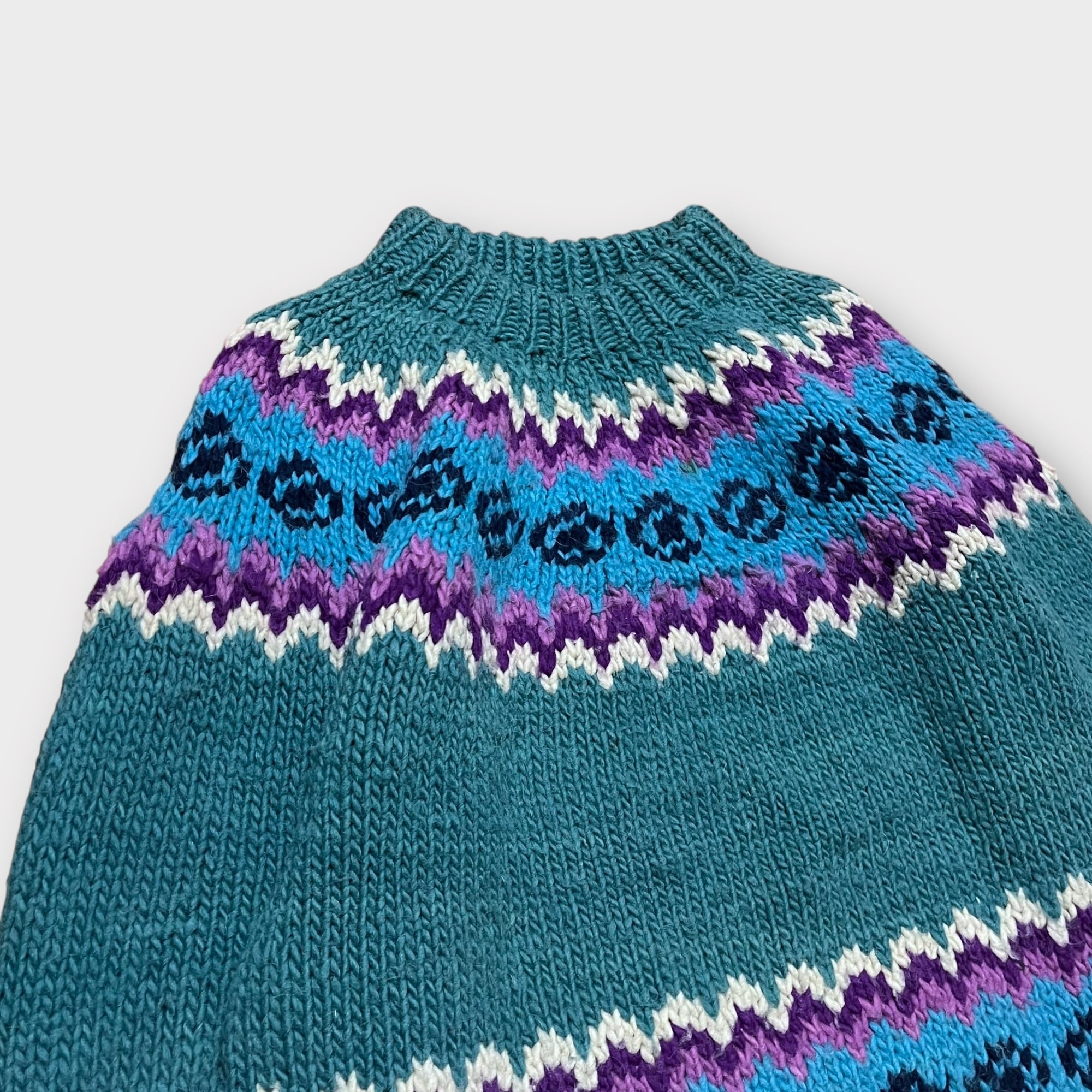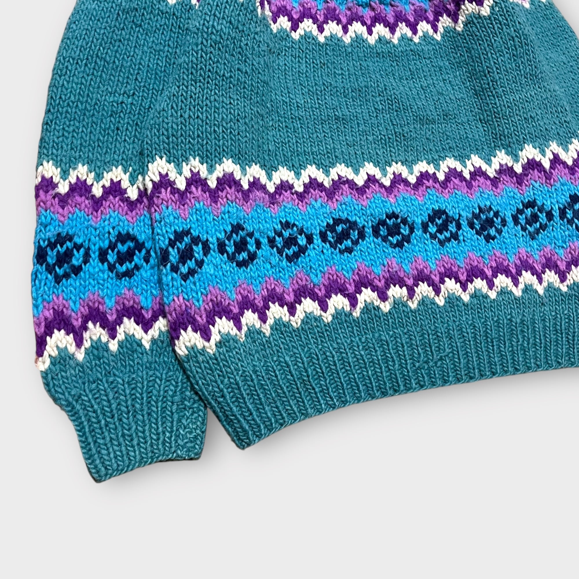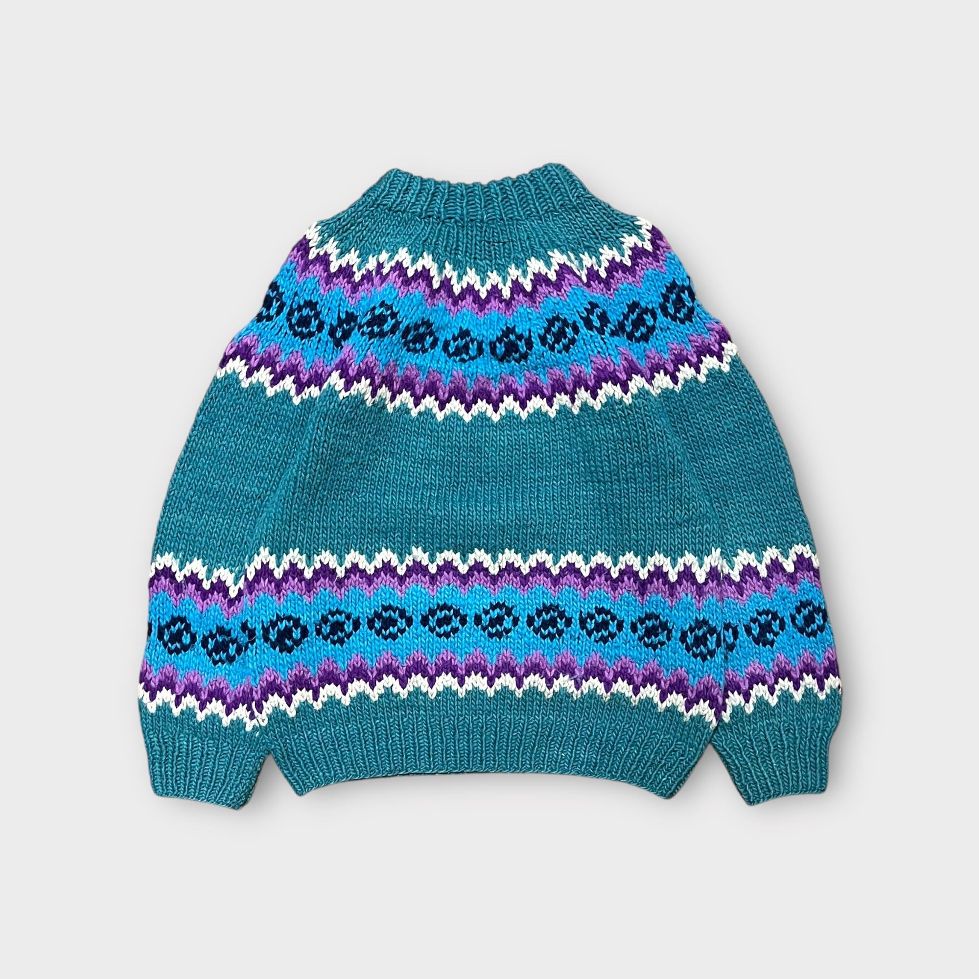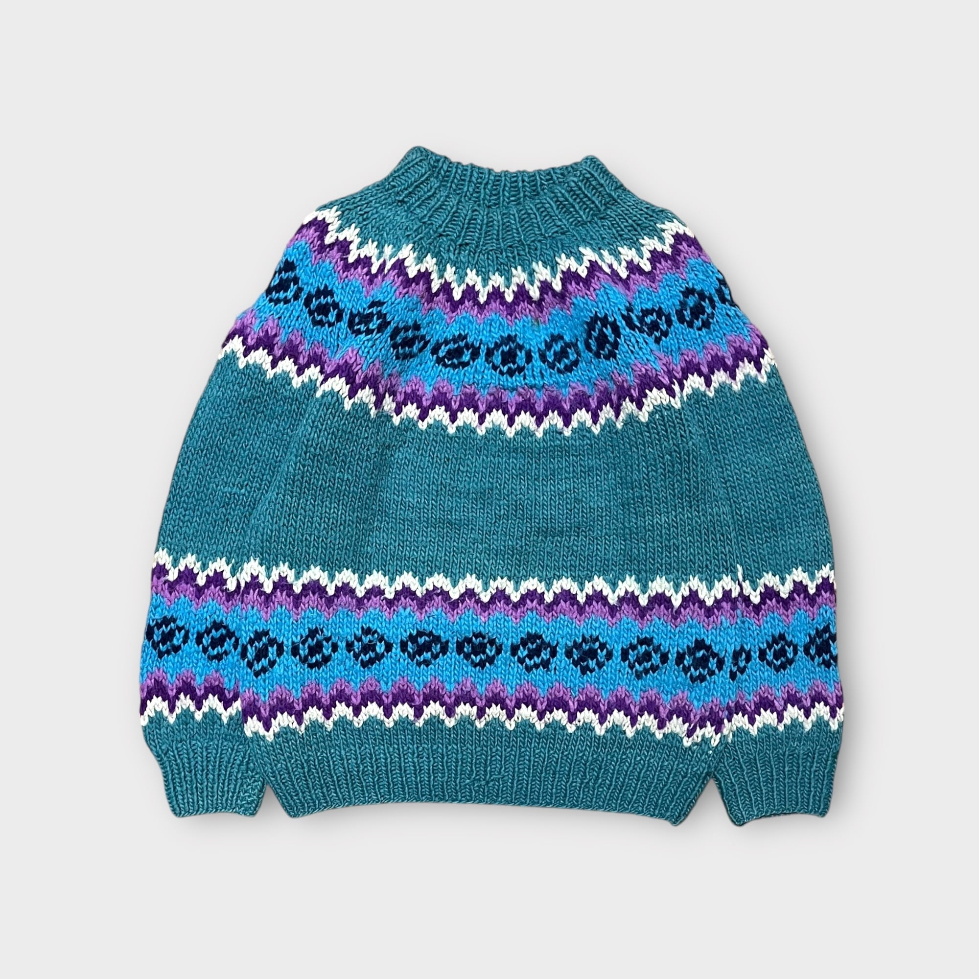 くすみのあるグリーンにパープルやライトブルーでノルディック風な柄が入ったとても珍しいカラーリングで抜群な雰囲気のニット!