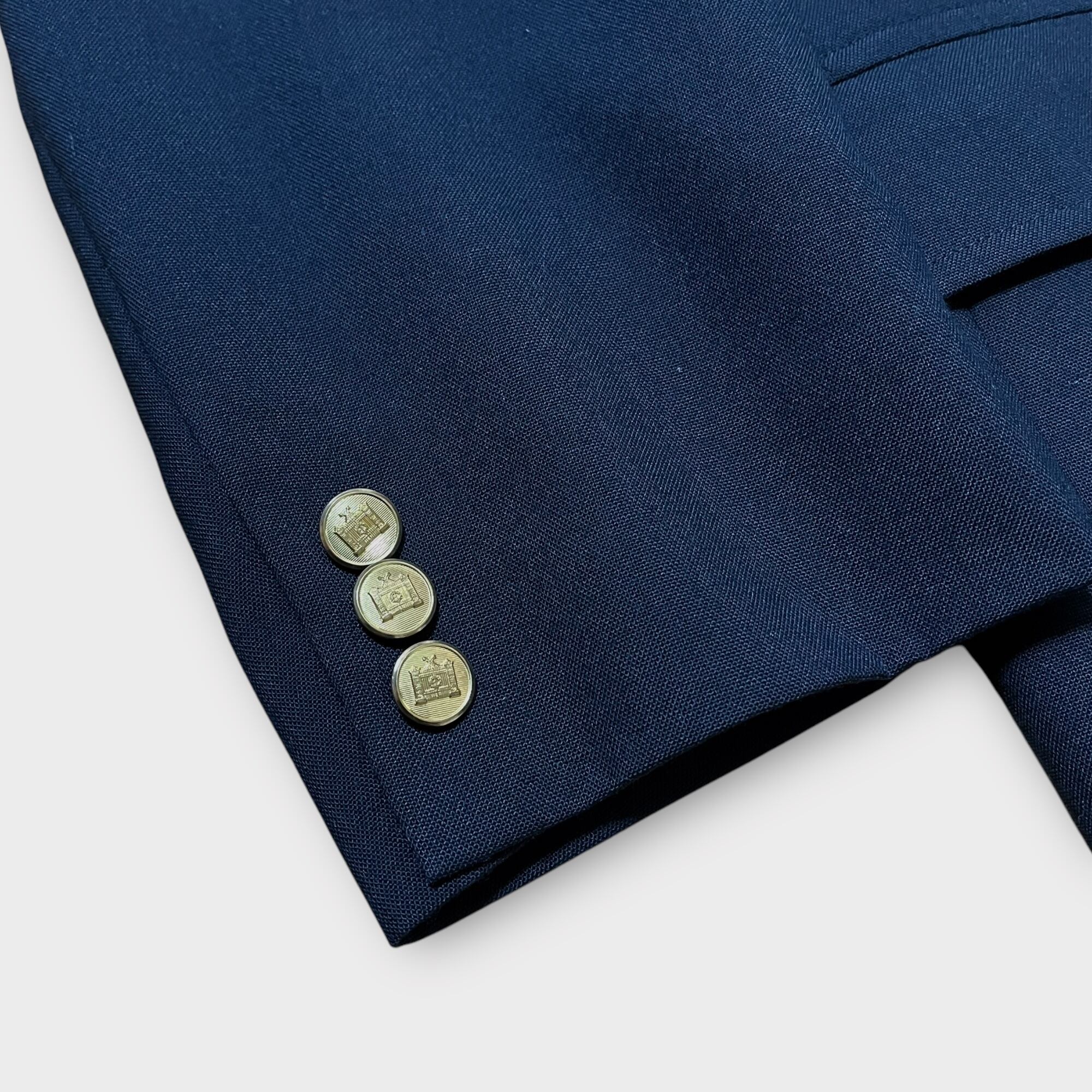 ダークネイビーにゴールドのメタルボタンの2Bのスタイルと使い勝手抜群な1枚